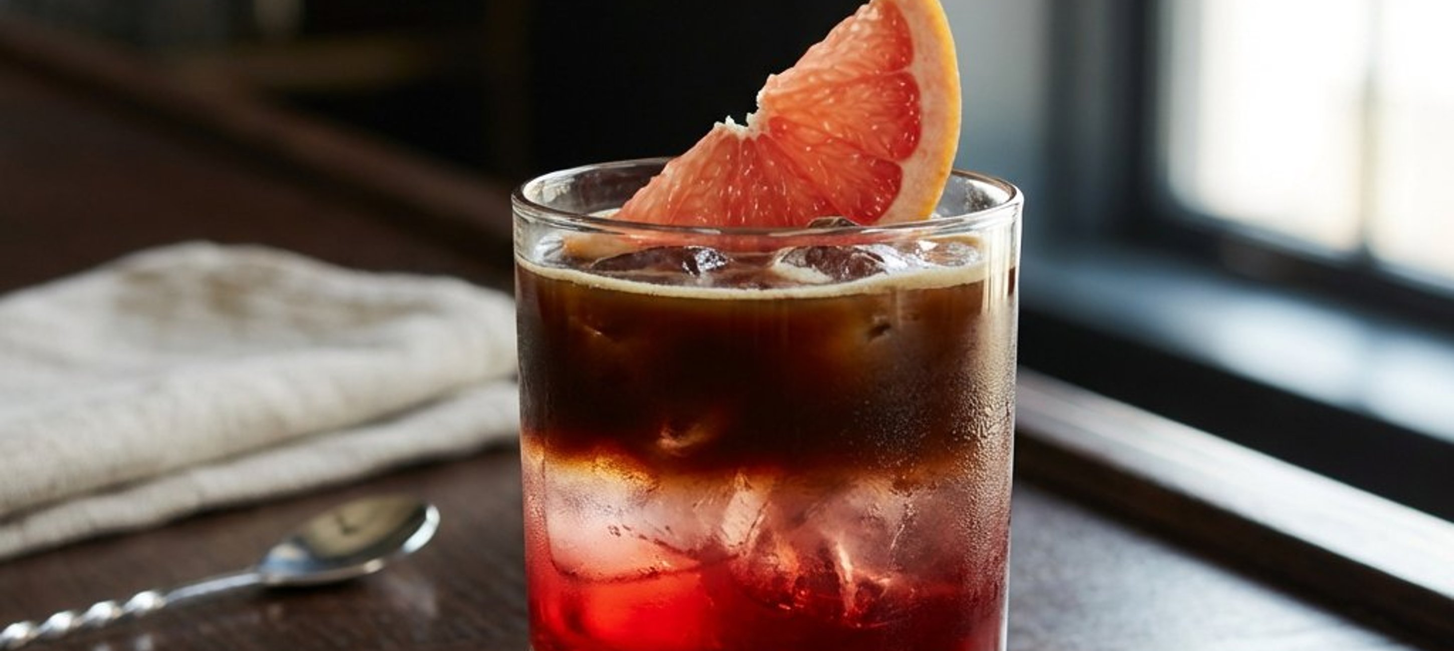 - 4Amestecați ușor cu o linguriță de bar, decorați cu o felie proaspătă de grepfrut roz și serviți imediat.