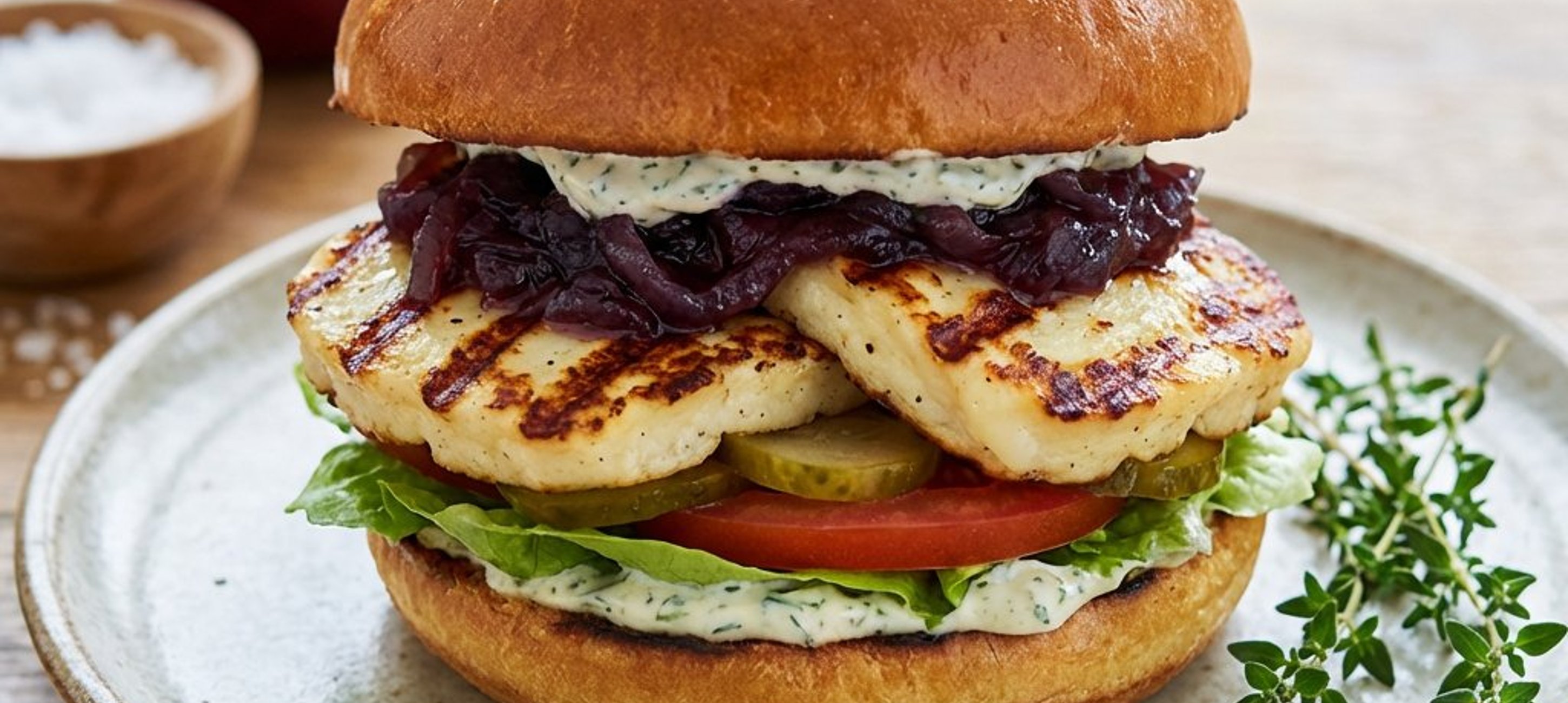 - 3Ungeți partea inferioară a chiflei cu dip-ul de ierburi, așezați o frunză de salată, apoi brânza Halloumi la grătar. Adăugați o felie de roșie și rondele de castravete murat. Puneți deasupra o porție generoasă de chutney de ceapă roșie. Ungeți și partea superioară a chiflei cu dip și închideți burgerul.