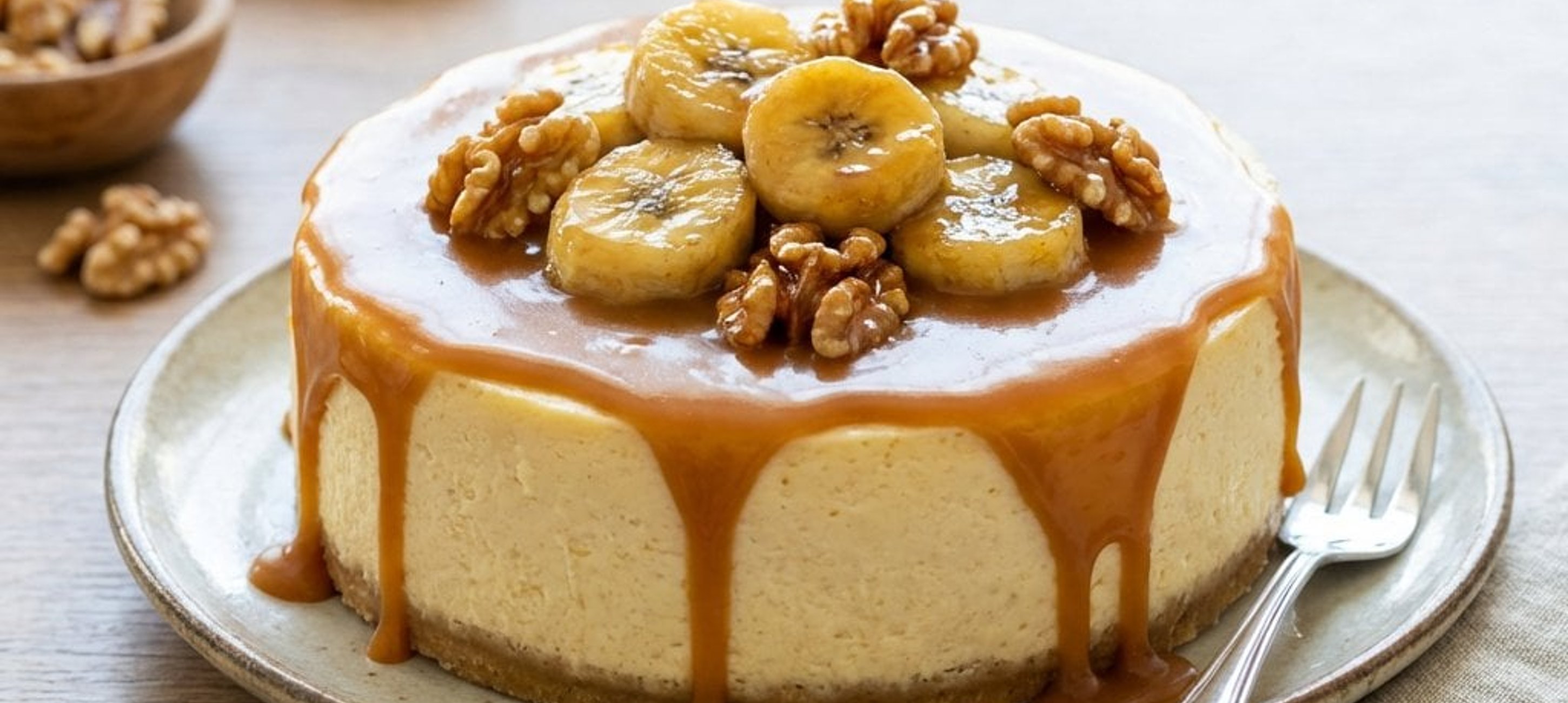 - 3Înainte de servire, decorați cheesecake-ul cu nucile glazurate și feliile de banană caramelizate.
