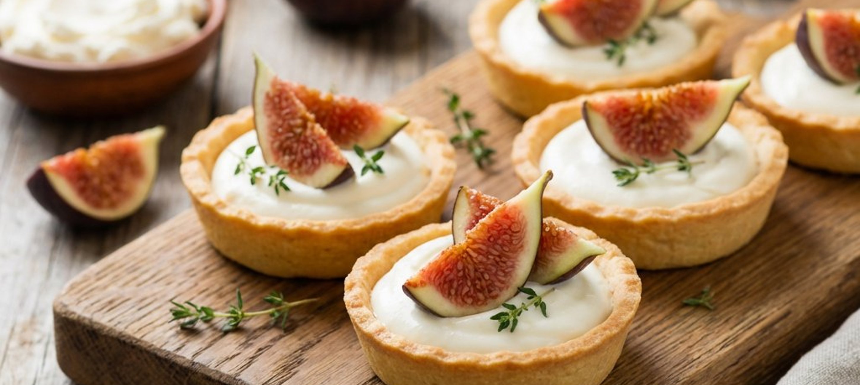 - 1Umpleți un poș cu cremă și decorați mini tartele. Lăsați-le la frigider 15 minute pentru a se întări puțin. Spălați smochinele și tăiați-le în optimi. Așezați câte o felie de smochină pe fiecare tartă, stropiți cu restul de miere și decorați cu o crenguță mică de cimbru.