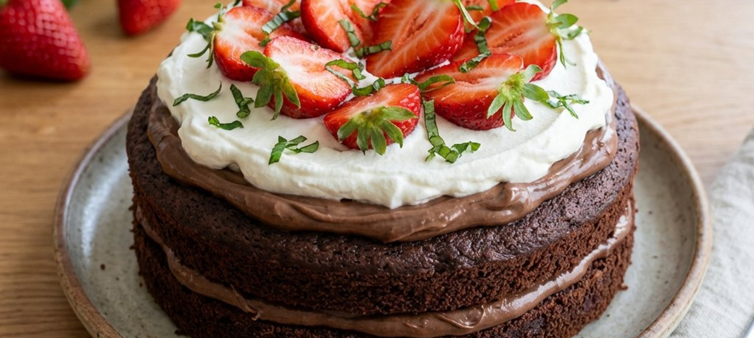 - 3Acoperiți cu al doilea blat și repetați procesul cu restul de cremă și frișcă. Decorați deasupra cu căpșunile păstrate întregi și frunze proaspete de busuioc.