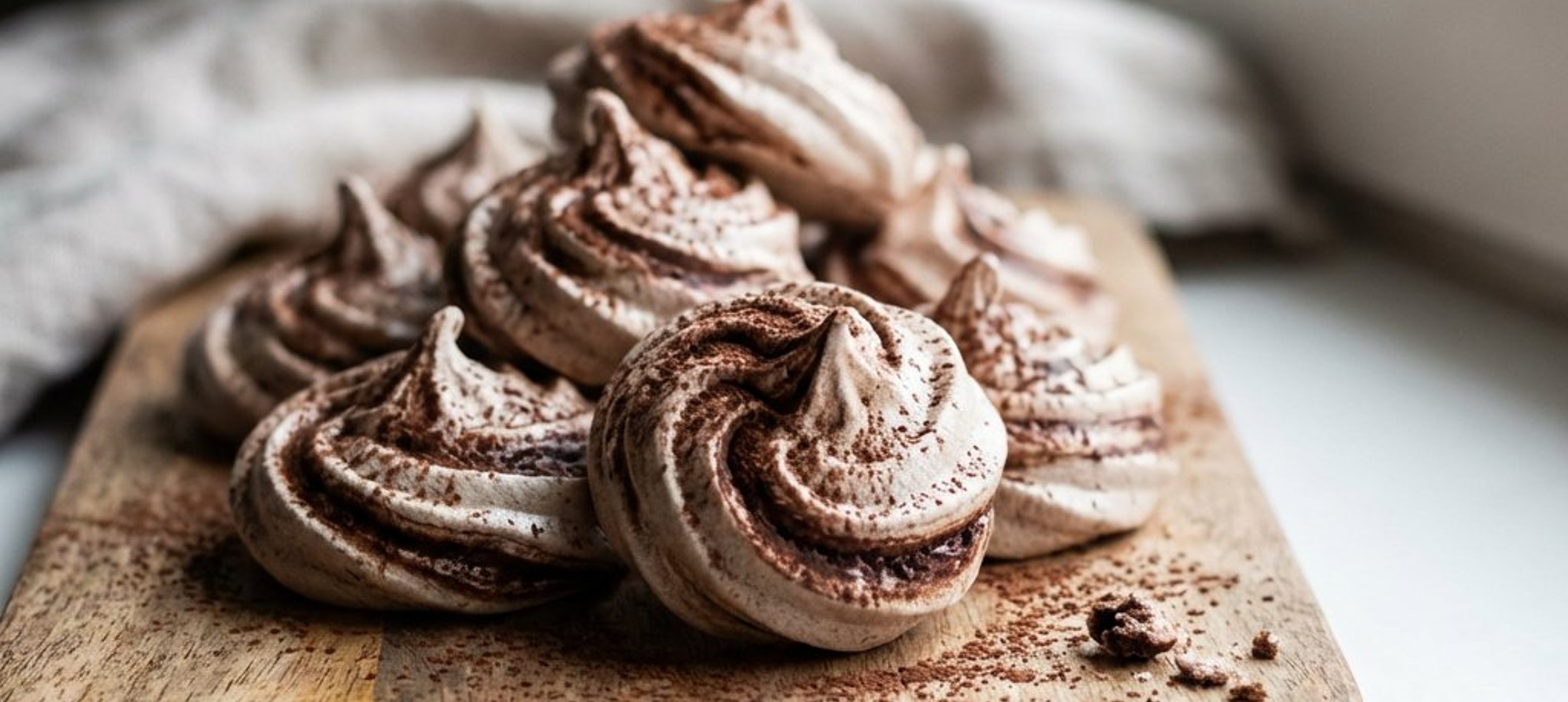 Pentru un aspect marmorat perfect, nu amesteca ciocolata cu spuma de albuș; lasă dungile de ciocolată să se formeze natural pe măsură ce presezi bezelele din poș.