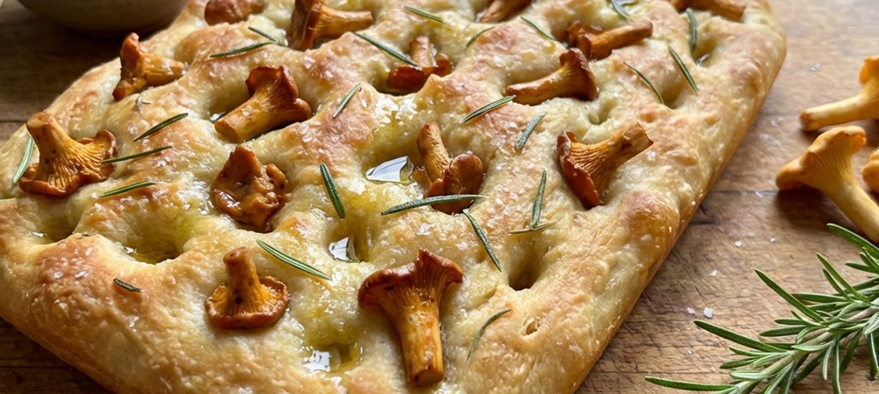 - 1În timp ce aluatul dospeste, curățați gălbiorii (tăiați-i pe jumătate pe cei mai mari) și amestecați-i cu o lingură de ulei de măsline și un praf de sare. Desfaceți frunzele de pe crenguța de rozmarin.