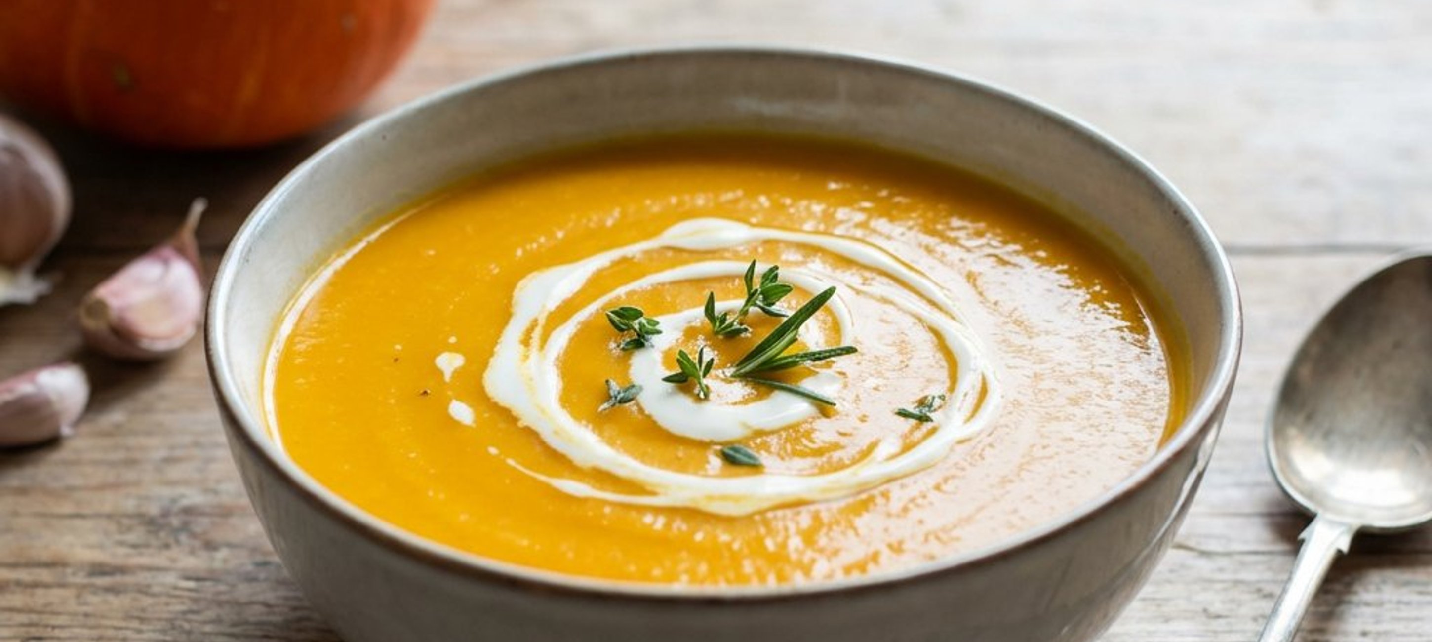 - 1După ce s-a copt, scoateți ierburile aromatice. Curățați usturoiul copt de coajă (miezul va fi moale și se va scoate ușor prin presare). Puneți dovleacul și usturoiul într-un blender sau folosiți un blender vertical, adăugând supa de legume caldă, și mixați până obțineți o cremă fină.