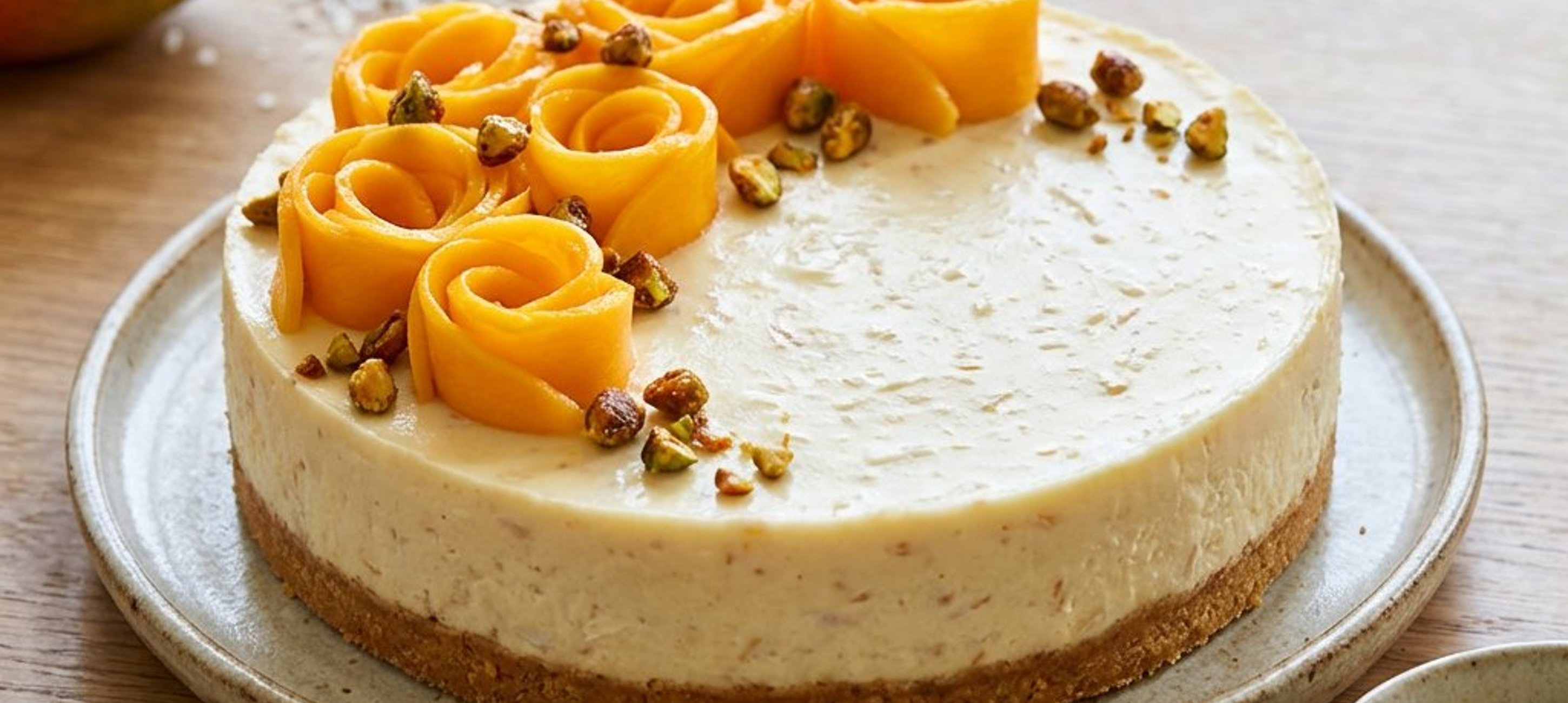 - 3Curăță mangoul de coajă, scoate sâmburele și taie felii subțiri (poți folosi un curățător de cartofi). Rulează feliile sub formă de trandafiri și decorează cheesecake-ul cu ele. Presară deasupra fisticul caramelizat.