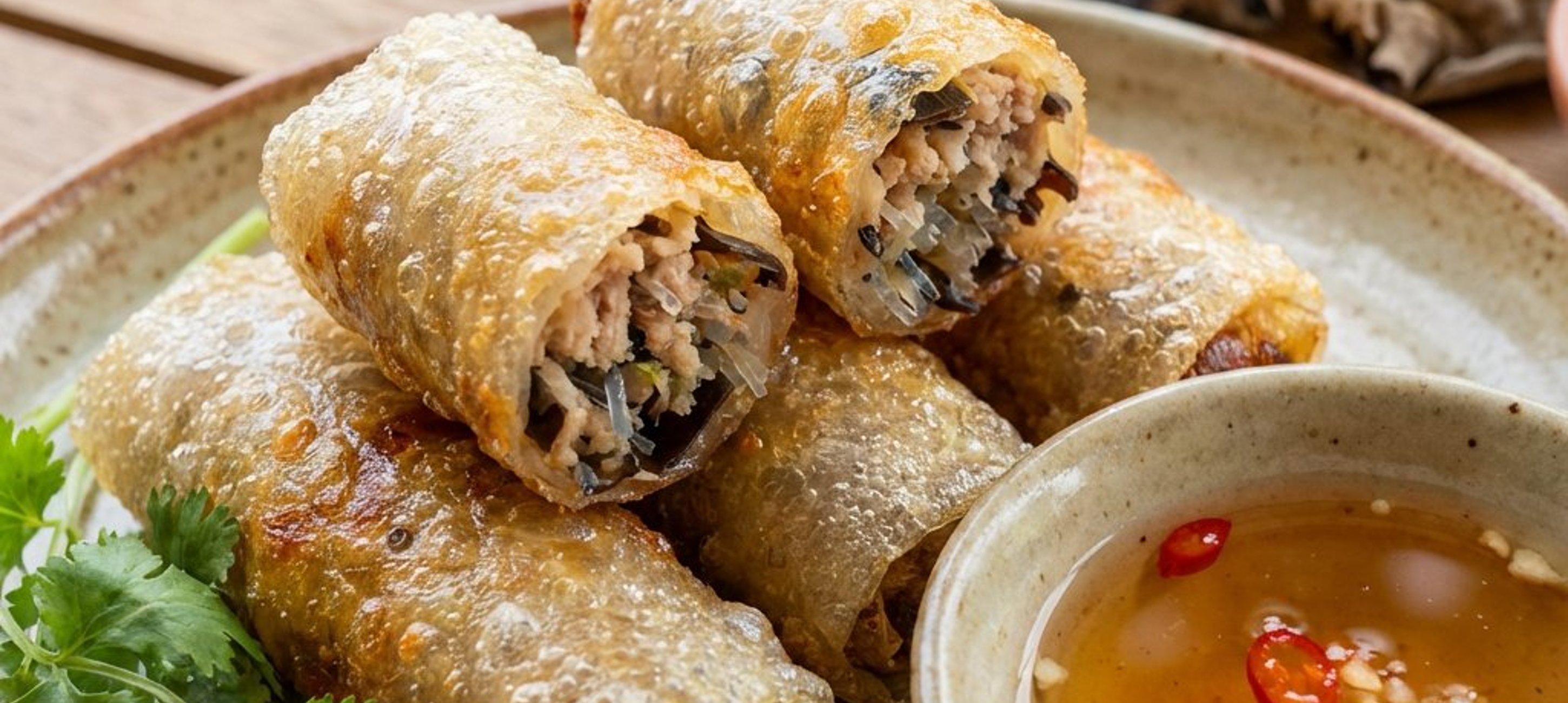 - 1Într-un bol mare, amestecă bine carnea tocată cu tăiețeii, ciupercile, mugurii de fasole mung, ceapa, coriandrul și morcovul. Adaugă oul pentru a lega compoziția. Condimentează cu 40 ml de sos de pește, sosul de soia, zahărul alb și piperul negru. Amestecă până la omogenizare.