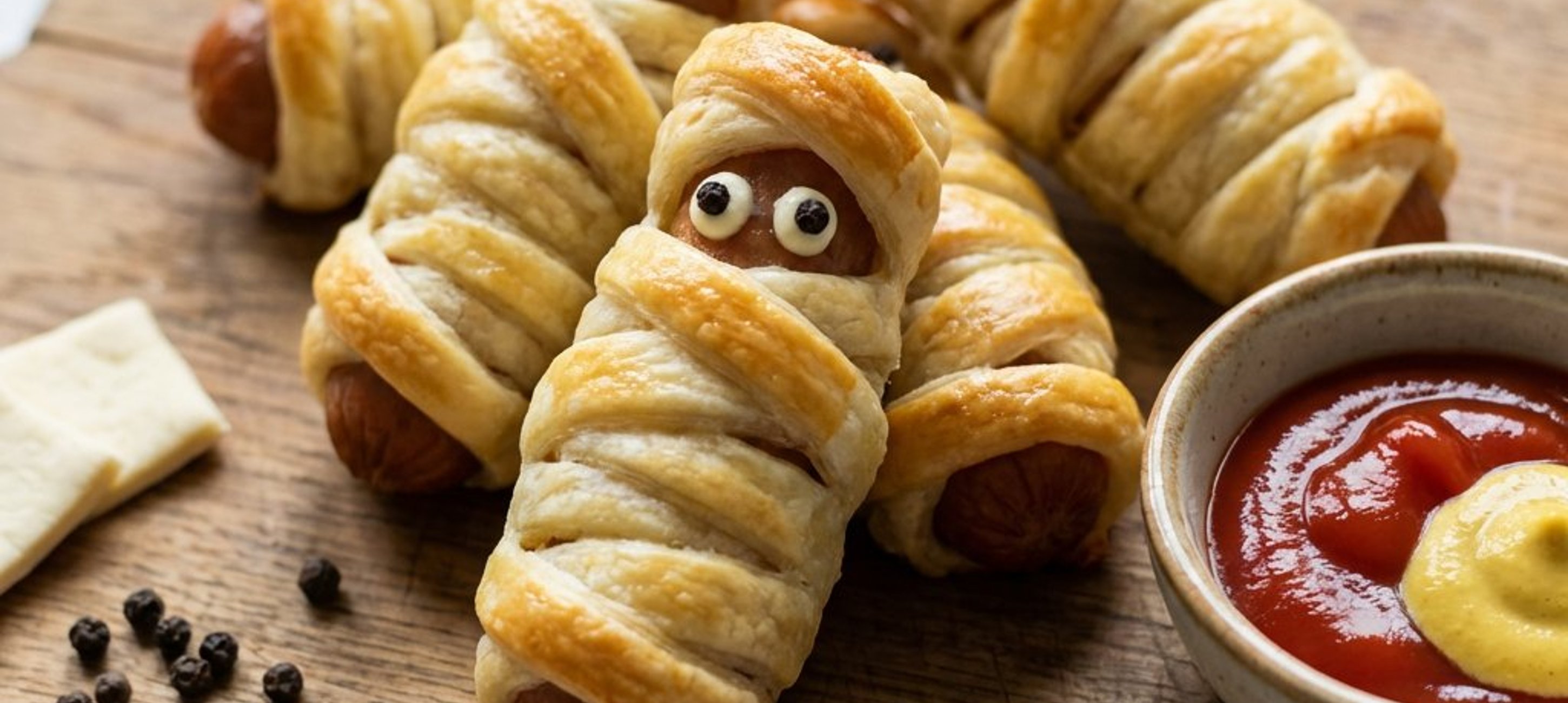 Pentru un efect vizual maxim, folosiți boabe de piper negru de dimensiuni similare pentru ochi. Dacă mumiile par prea 'tăcute', puteți desena și o mică gură folosind ketchup!