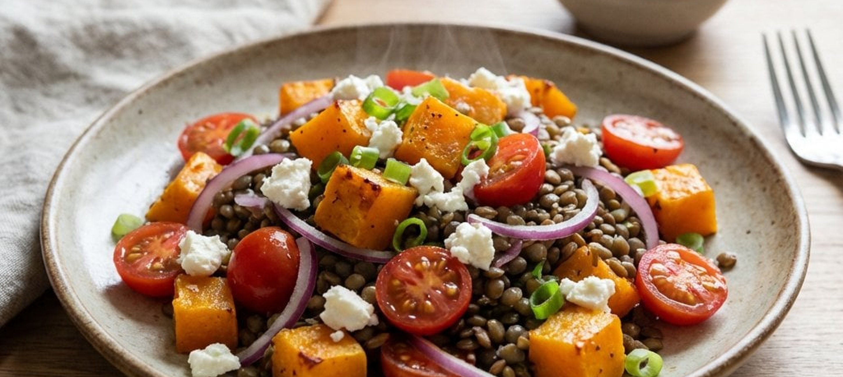 - 3Încorporați roșiile proaspete în amestecul de linte și împărțiți compoziția pe farfurii. Decorați cu bucățile de dovleac copt, presărați brânza feta și ceapa verde. Serviți imediat cât este caldă.