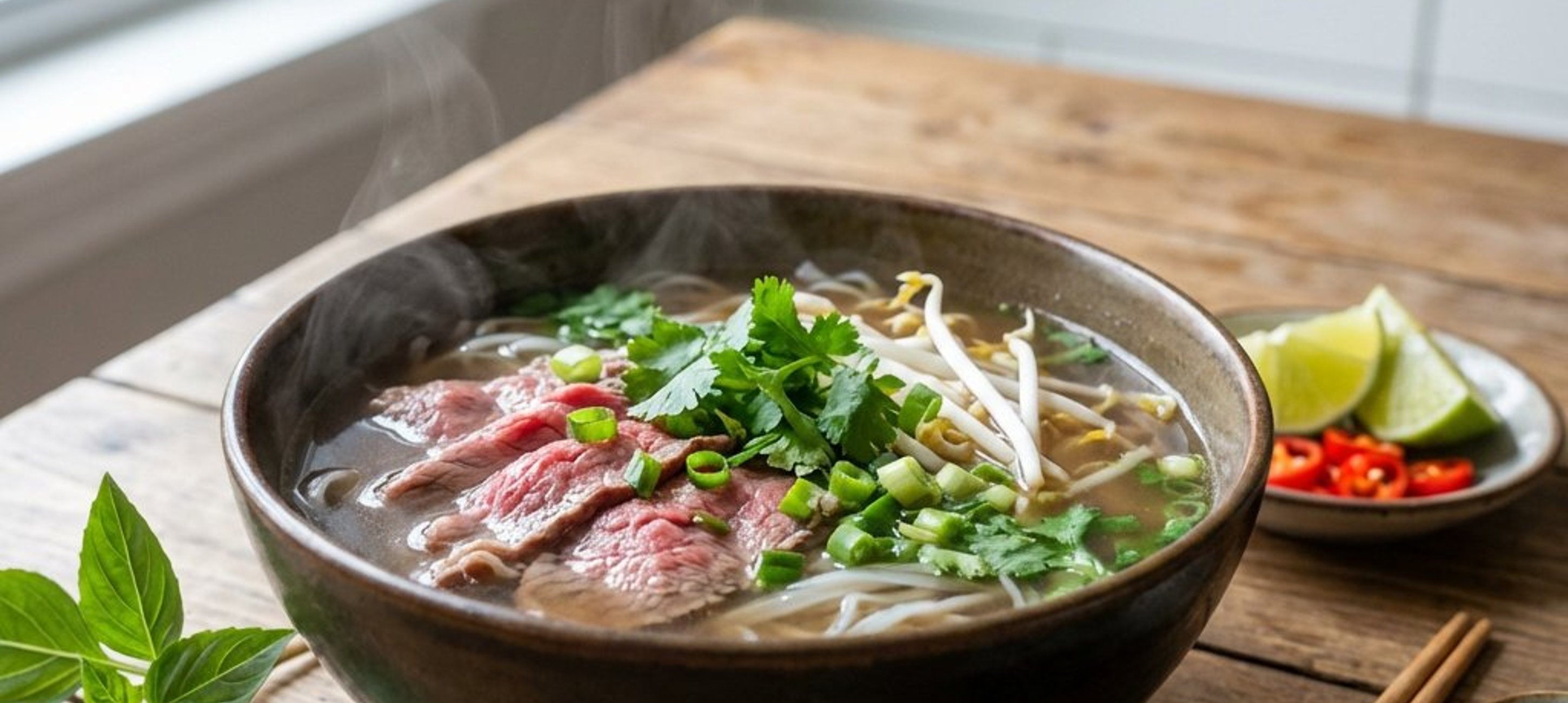 Secretul unei supe Pho reușite stă în răbdare și în coacerea ingredientelor aromatice (ceapa și ghimbirul) înainte de a le adăuga în bulion. Acest pas oferă supei o profunzime și o culoare aurie inconfundabilă.