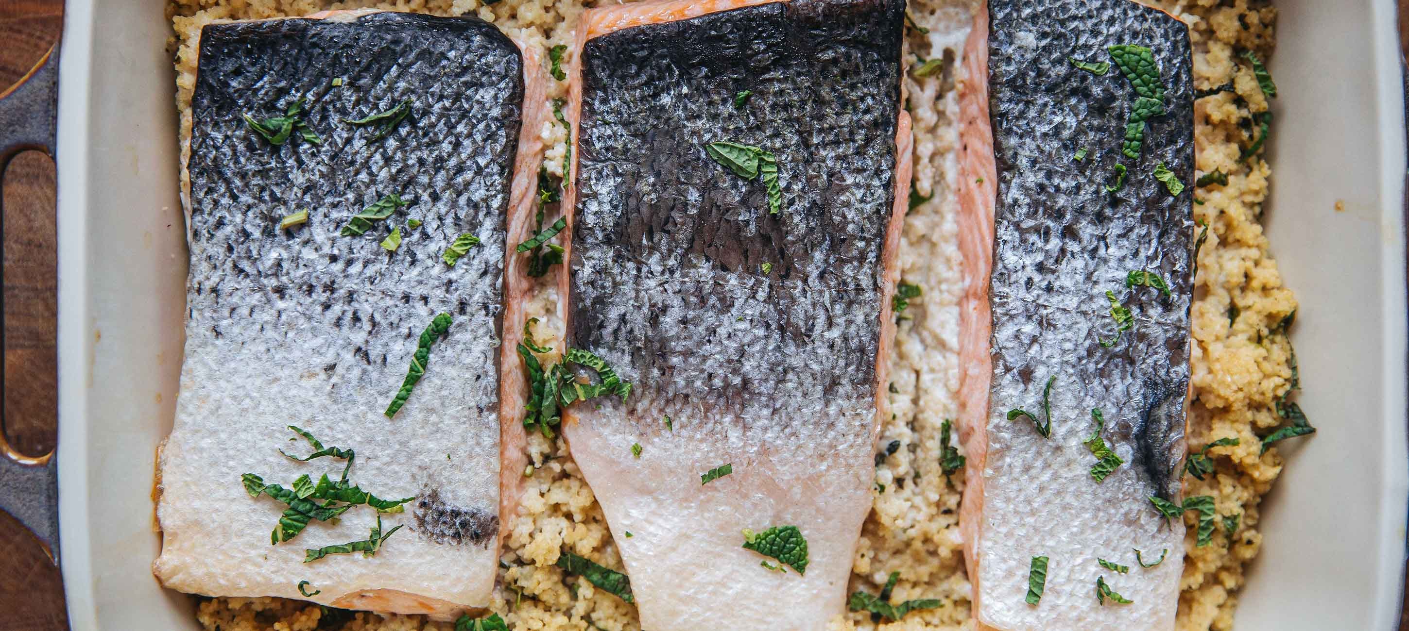 - 2Prepară couscousul conform instrucțiunilor de pe ambalaj. După ce este gata, adaugă menta, pătrunjelul, coaja și sucul de lămâie, busuiocul, smântâna, sarea și piperul, amestecă bine și transferă totul în vasul de copt. Așază fileurile de somon cu pielea în sus peste couscous, introdu vasul în cuptorul preîncălzit și coace timp de 15–17 minute la 180–185 °C.