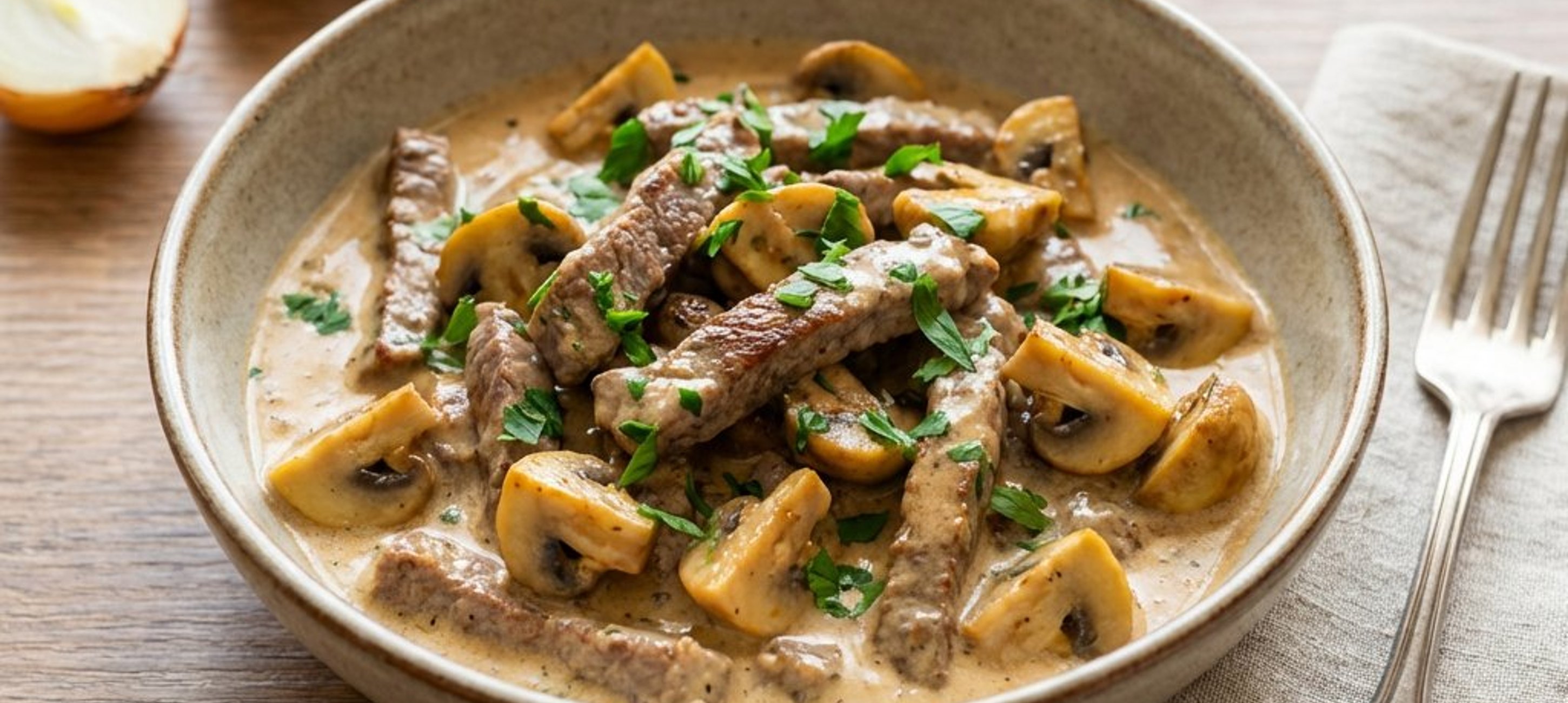 - 3Puneți tigaia înapoi pe foc și turnați 100 ml de apă (sau supă de vită) pentru a deglasa resturile rumenite de pe fundul tigăii. Lăsați lichidul să scadă aproape de tot, apoi încorporați smântâna și opriți focul. Imediat ce smântâna s-a încălzit, adăugați carnea, ciupercile și ceapa înapoi în tigaie și amestecați bine. Acoperiți și lăsați să se odihnească 5 minute fără a mai fierbe. Serviți cu orez sau paste, presărat cu pătrunjel verde proaspăt.