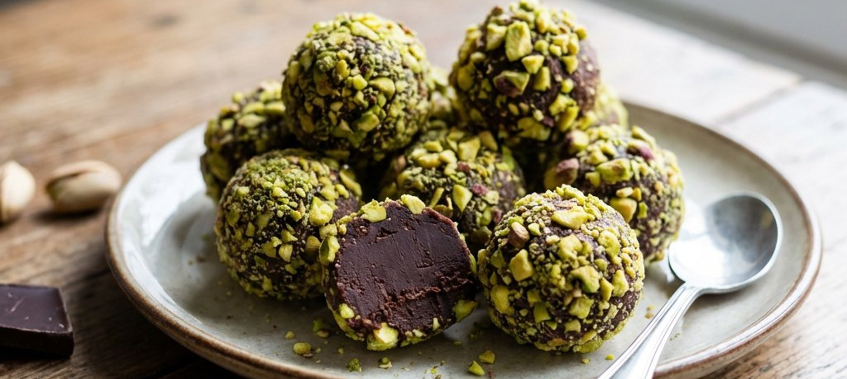 - 3Tocați fisticul în bucățele mici. Din compoziția întărită, luați cu o linguriță porții mici și formați biluțe cu palmele (ușor umezite cu apă rece pentru a nu se lipi). Treceți imediat fiecare trufă prin fisticul tocat pentru a o acoperi uniform. Depozitați la rece până la servire.
