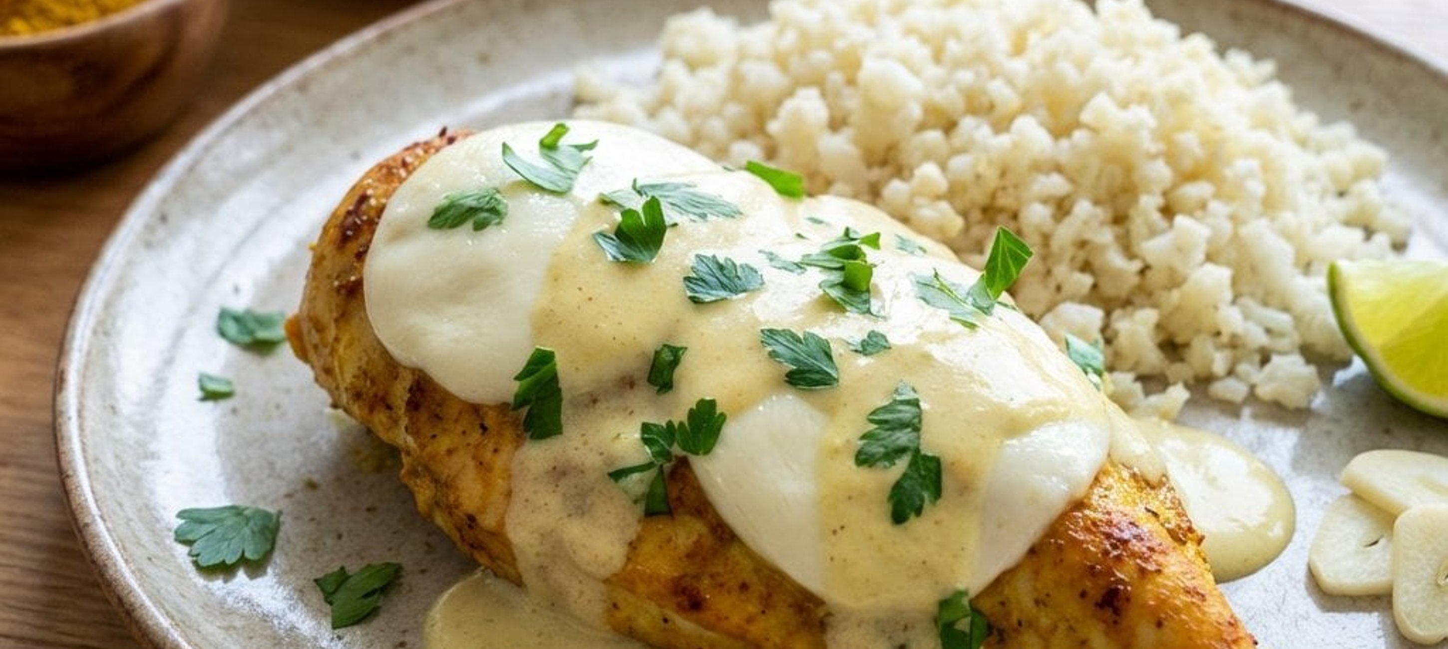- 2Într-o tigaie cu o lingură de ulei de măsline, căliți ceapa până devine aurie, apoi adăugați usturoiul și lăsați-l să-și elibereze aroma. Adăugați conopida tocată în tigaie și sotați timp de aproximativ 5 minute, până când se înmoaie ușor. Condimentați cu sare și piper după gust. La final, stropiți cu suc de lime și adăugați pătrunjelul verde tocat. Serviți pieptul de pui cald alături de orezul de conopidă, turnând deasupra sosul cremos din tavă.
