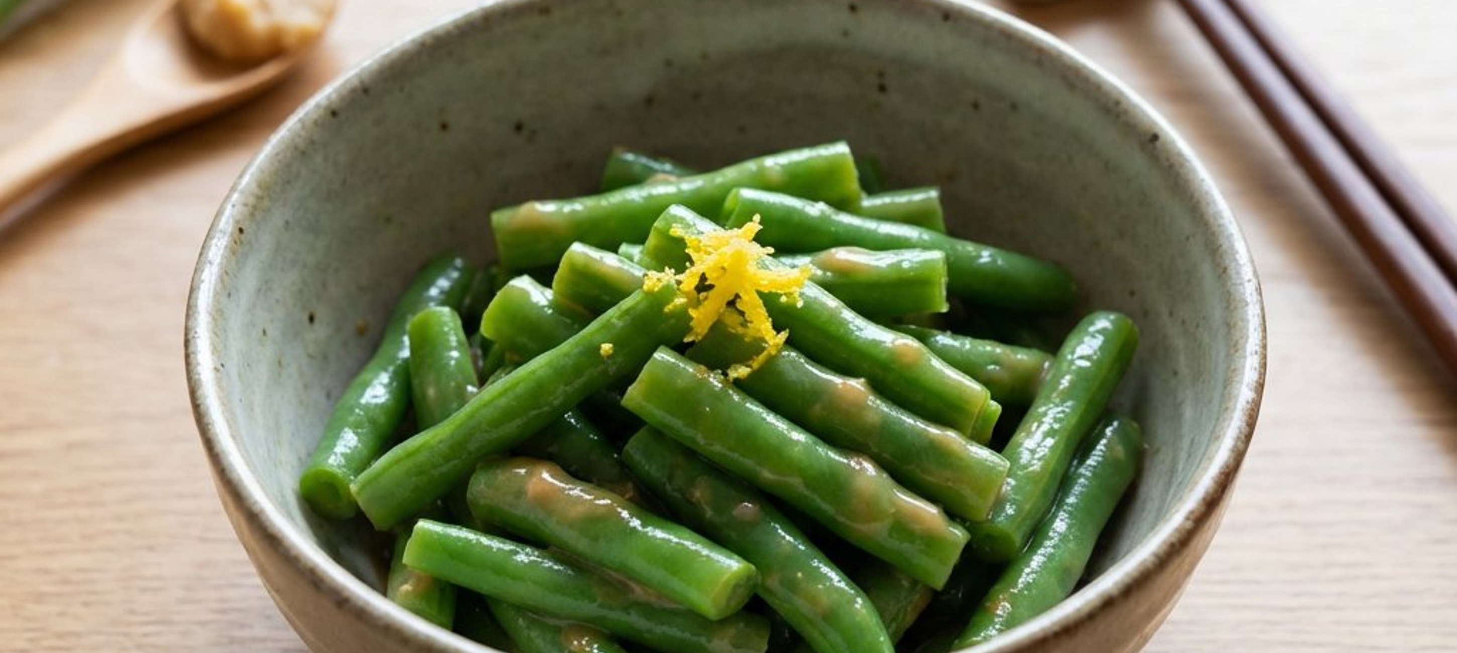 - 2Într-un bol, amestecați pasta miso, mirin-ul și muștarul, apoi adăugați coaja rasă de lămâie. Adăugați păstăile de fasole și amestecați bine, astfel încât să fie complet acoperite de sos. Serviți imediat ca garnitură sau gustare ușoară.