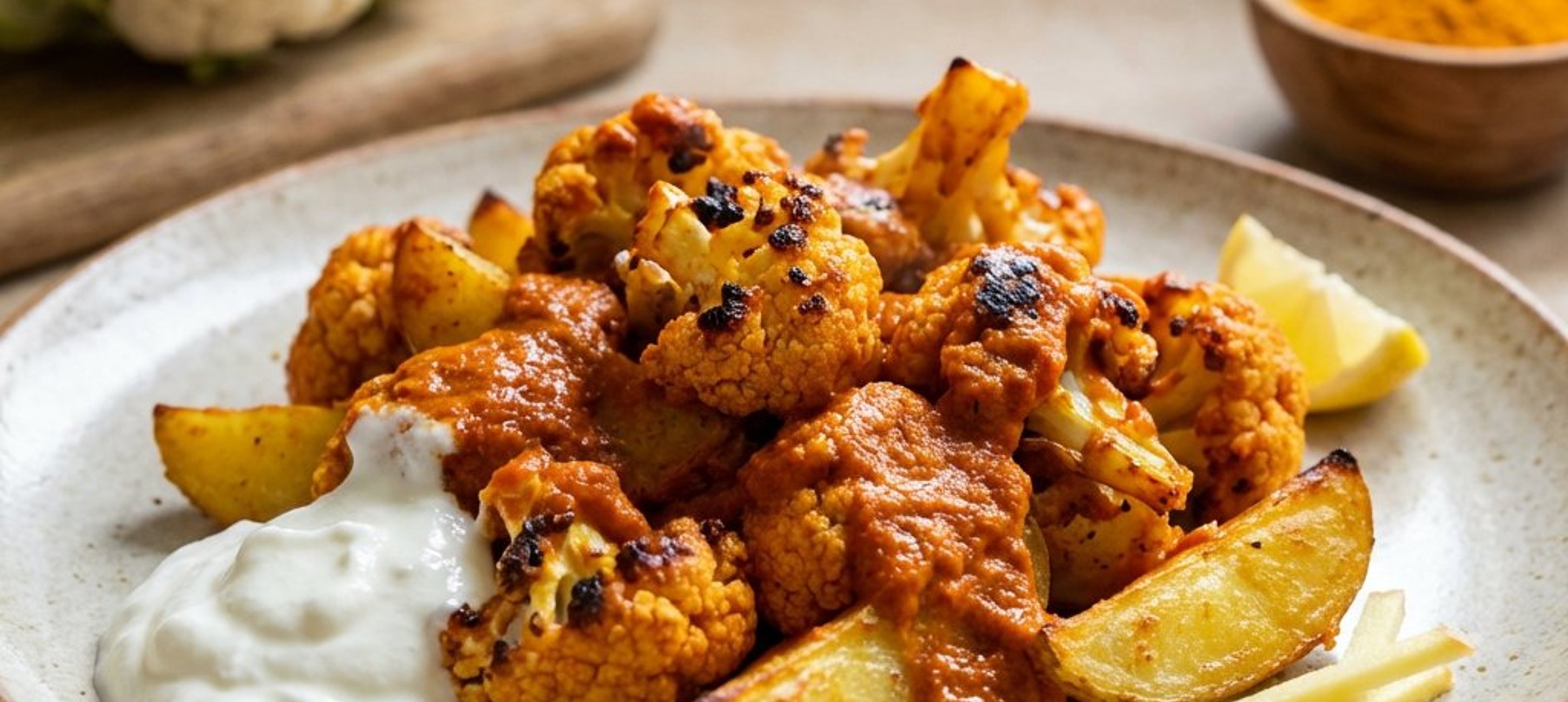 - 6După ce conopida și cartofii sunt gata, așezați-le în tavă peste sosul de roșii. Acoperiți-le uniform cu amestecul de iaurt și tandoori masala pregătit la pasul 4.