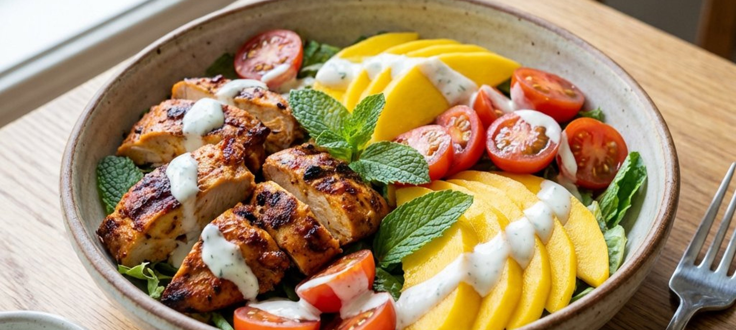 - 3Într-un bol încăpător, amestecă mixul de salată cu ceapa feliată, roșiile tăiate și cubulețele de mango. Condimentează cu restul de ulei și puțină sare.