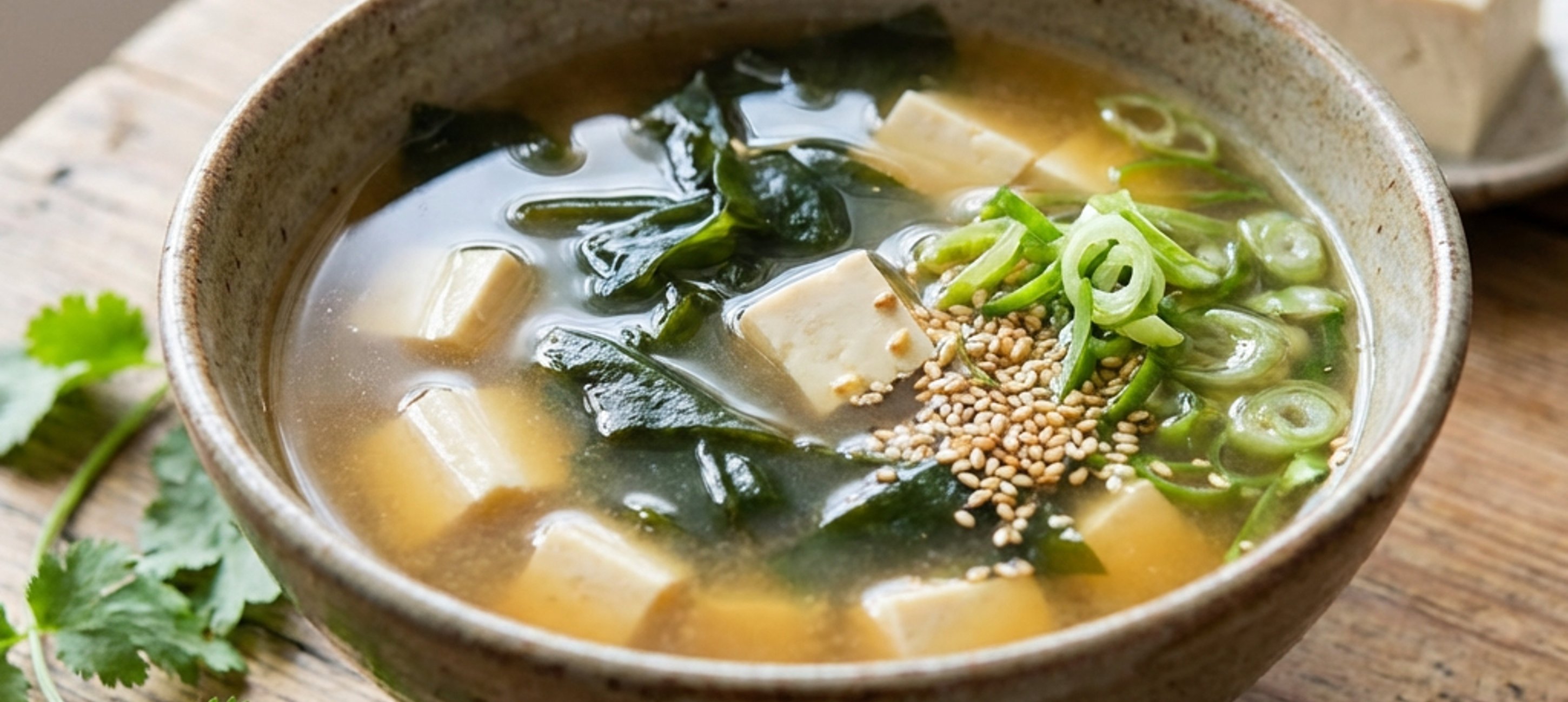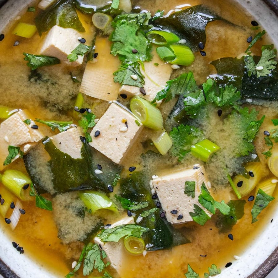- 2Adaugă tofu, ceapa verde și sosul de soia în oală și fierbe ușor încă 5 minute, apoi încorporează bine pasta miso. Continuă fierberea încă 5 minute, până când pasta se dizolvă complet. Servește supa cu coriandru tocat și semințe de susan.