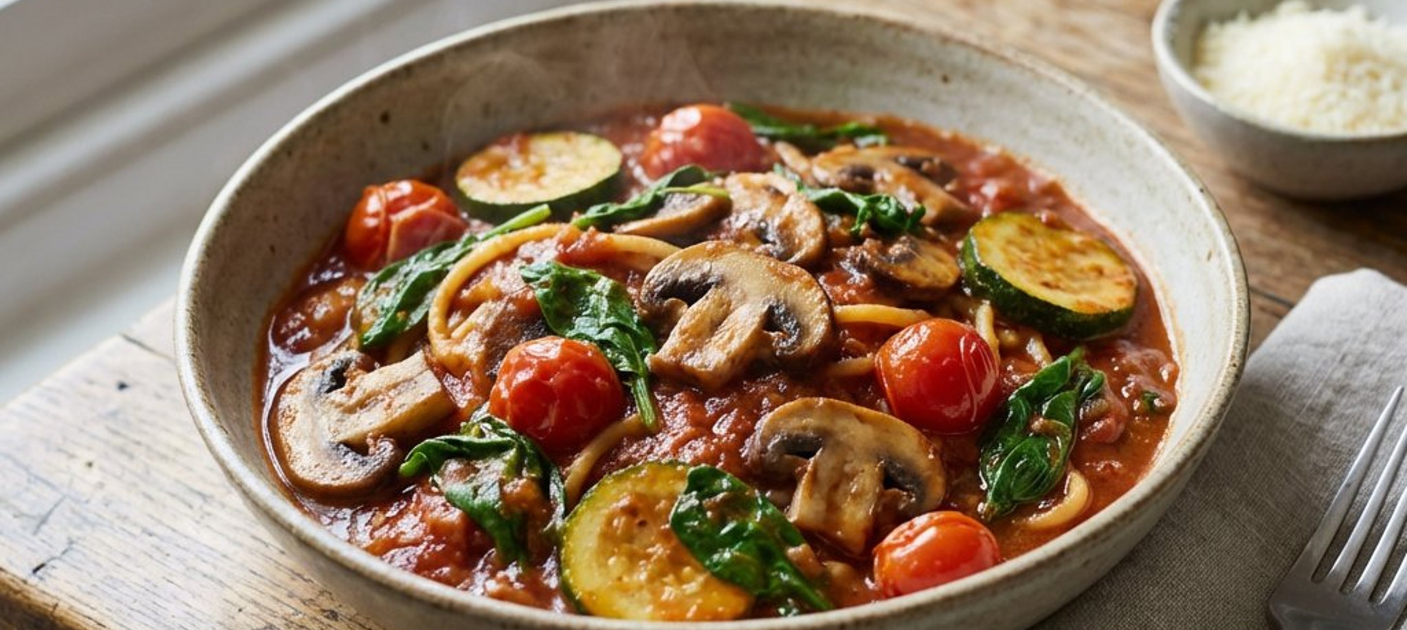 - 2Adăugați zucchini tăiat, roșiile cubulețe, ciupercile feliate și spanacul baby. Amestecați totul, adăugați pastele crude și turnați 700 ml de apă. Amestecați din nou, condimentați cu sare și piper, apoi fierbeți sub capac, amestecând ocazional, timp de aproximativ 10-15 minute, până când pastele sunt moi și apa a scăzut aproape de tot.