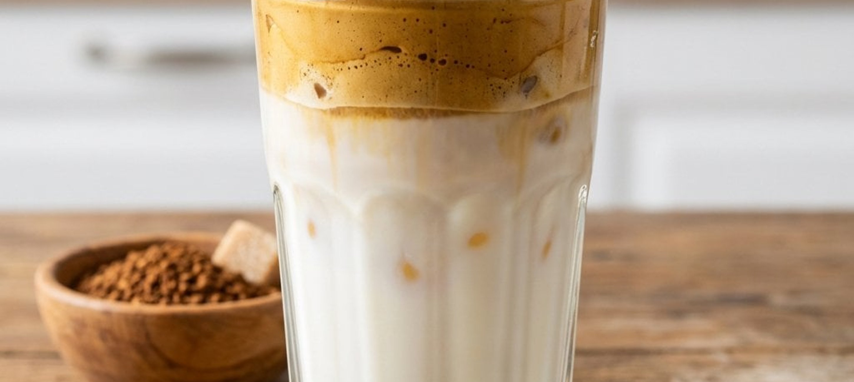 - 3Distribuie spuma de cafea pregătită anterior deasupra laptelui. Cafeaua Dalgona este gata de servit!