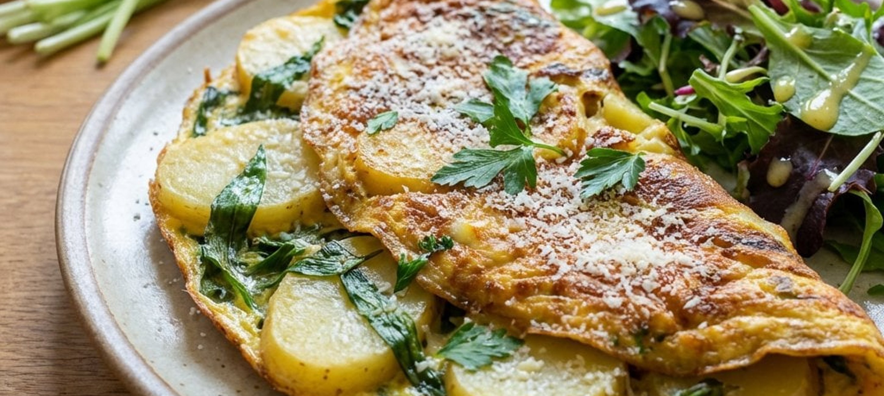 - 2Într-o tigaie de mărime medie, încingeți uleiul și căliți ceapa. Adăugați feliile de cartofi și prăjiți-le puțin, amestecând ocazional. Adăugați leurda și pătrunjelul. De îndată ce verdețurile se înmoaie, turnați ouăle bătute și acoperiți cu un capac. Prăjiți câteva minute până când ouăle sunt gătite și la suprafață. Dacă doriți, puteți întoarce omleta cu ajutorul unei farfurii pentru a o rumeni și pe cealaltă parte. Când este gata, presărați brânza Grana Padano rasă deasupra.