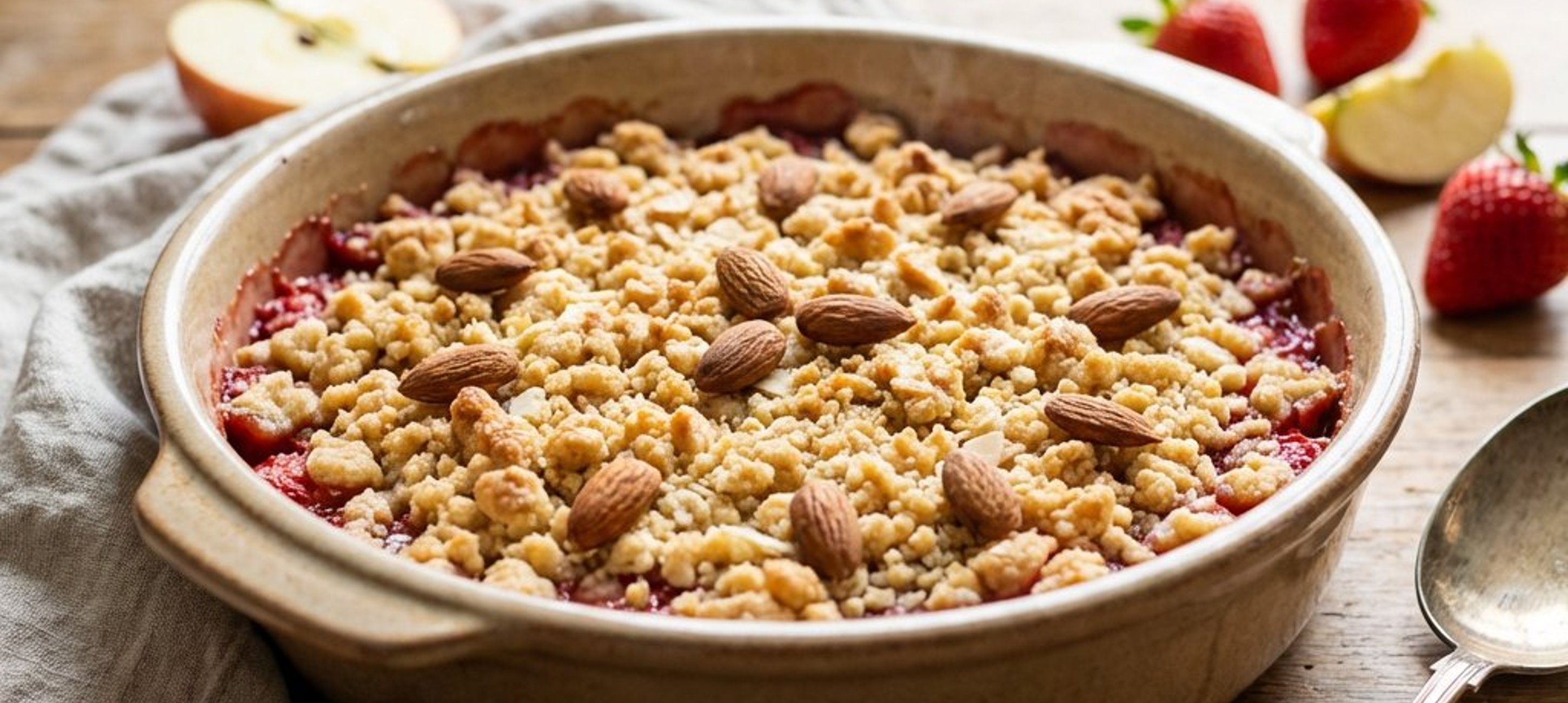 - 2Așezați amestecul de mere la baza formelor, adăugați deasupra umplutura de căpșuni și acoperiți totul cu aluatul fărâmicios. Presărați deasupra migdalele întregi.