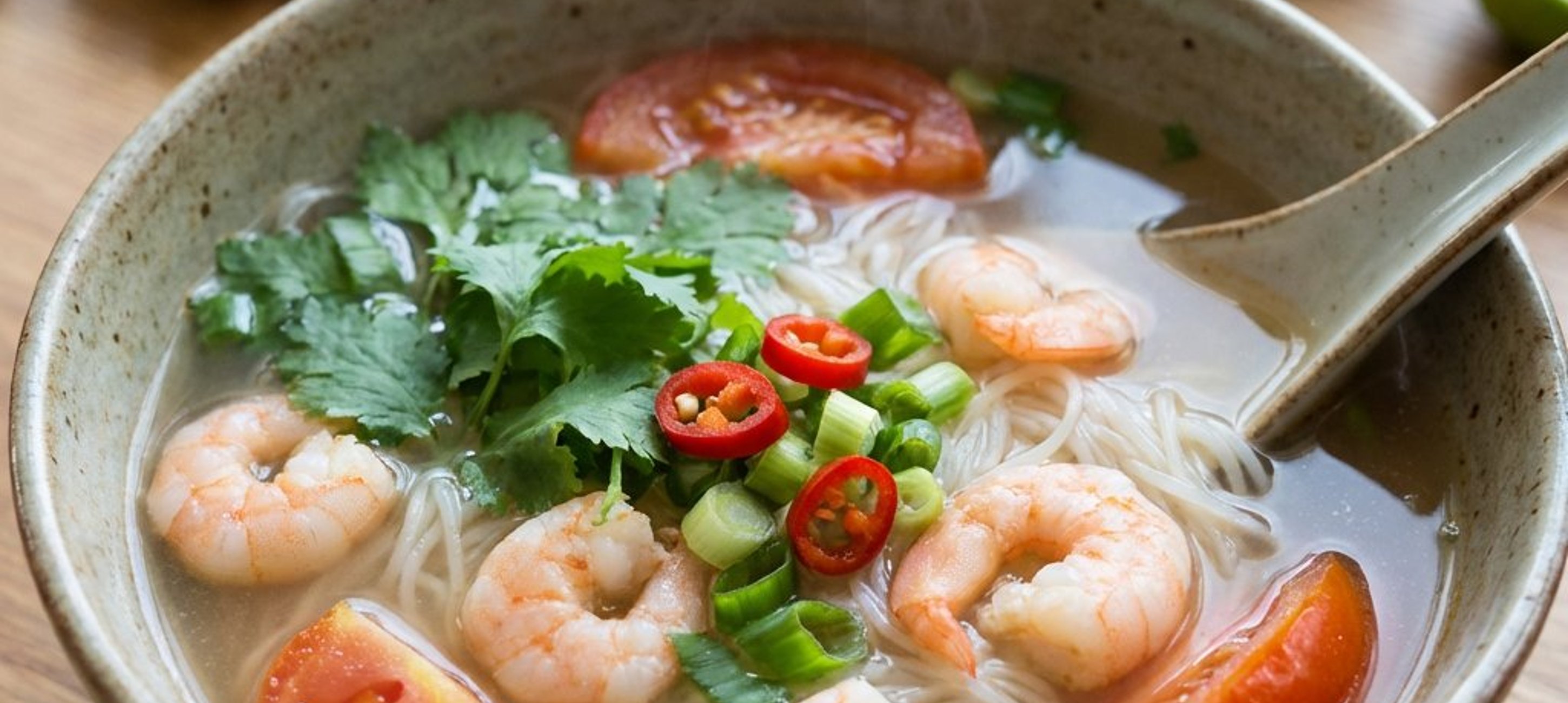- 4Pentru servire, așezați în boluri tăiețeii calzi, cozile de creveți gătite, bucățelele de roșii, ceapa verde tocată, coriandrul proaspăt și feliile de ardei iute. Turnați deasupra bulionul clocotit și savurați imediat.