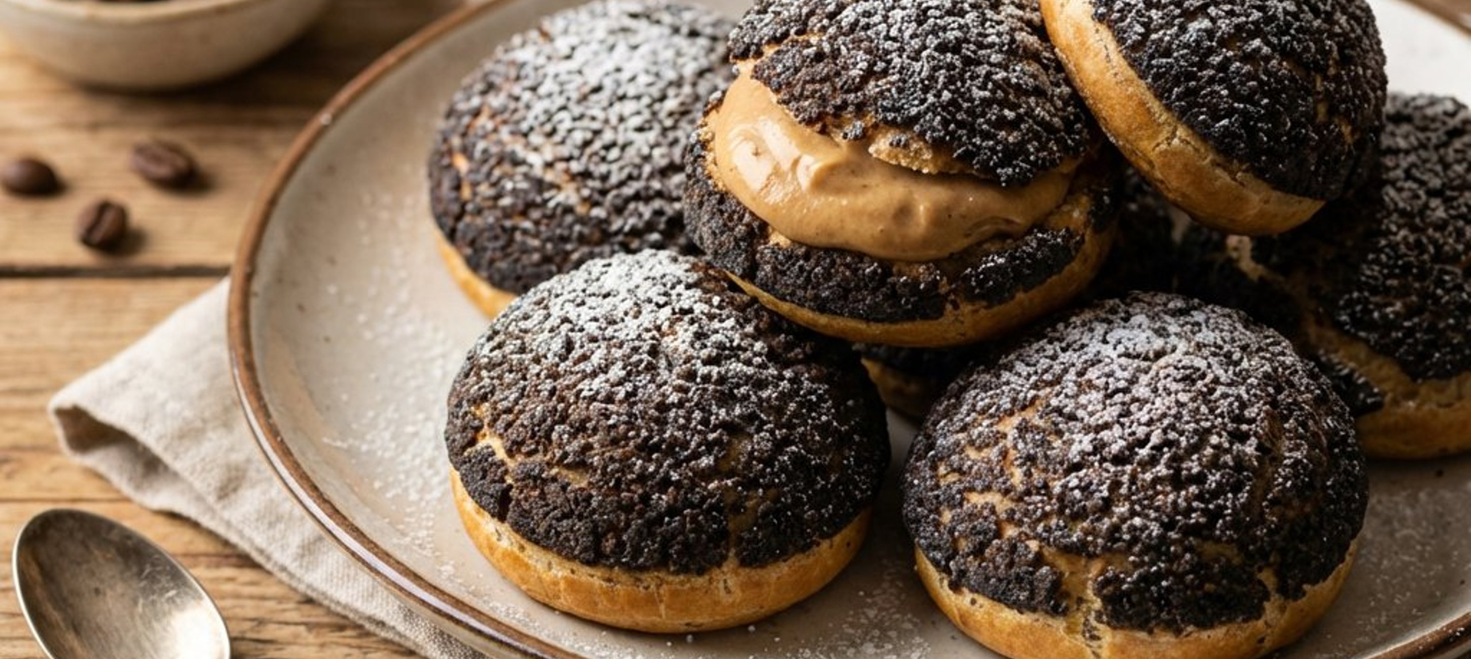 - 4Pentru stratul craquelin: amestecați rapid 50 g de făină, macul, 65 g de zahăr tos și 50 g de unt rece. Întindeți între două foi de copt la 2-3 mm grosime și dați la rece. Decupați cercuri de 4 cm.