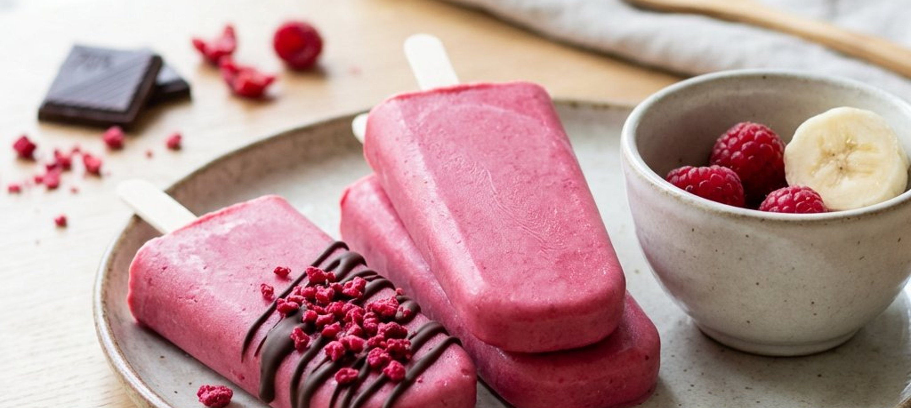 - 4Dacă doriți un aspect festiv, glazurați înghețatele cu ciocolată neagră topită și presărați zmeură liofilizată zdrobită deasupra.
