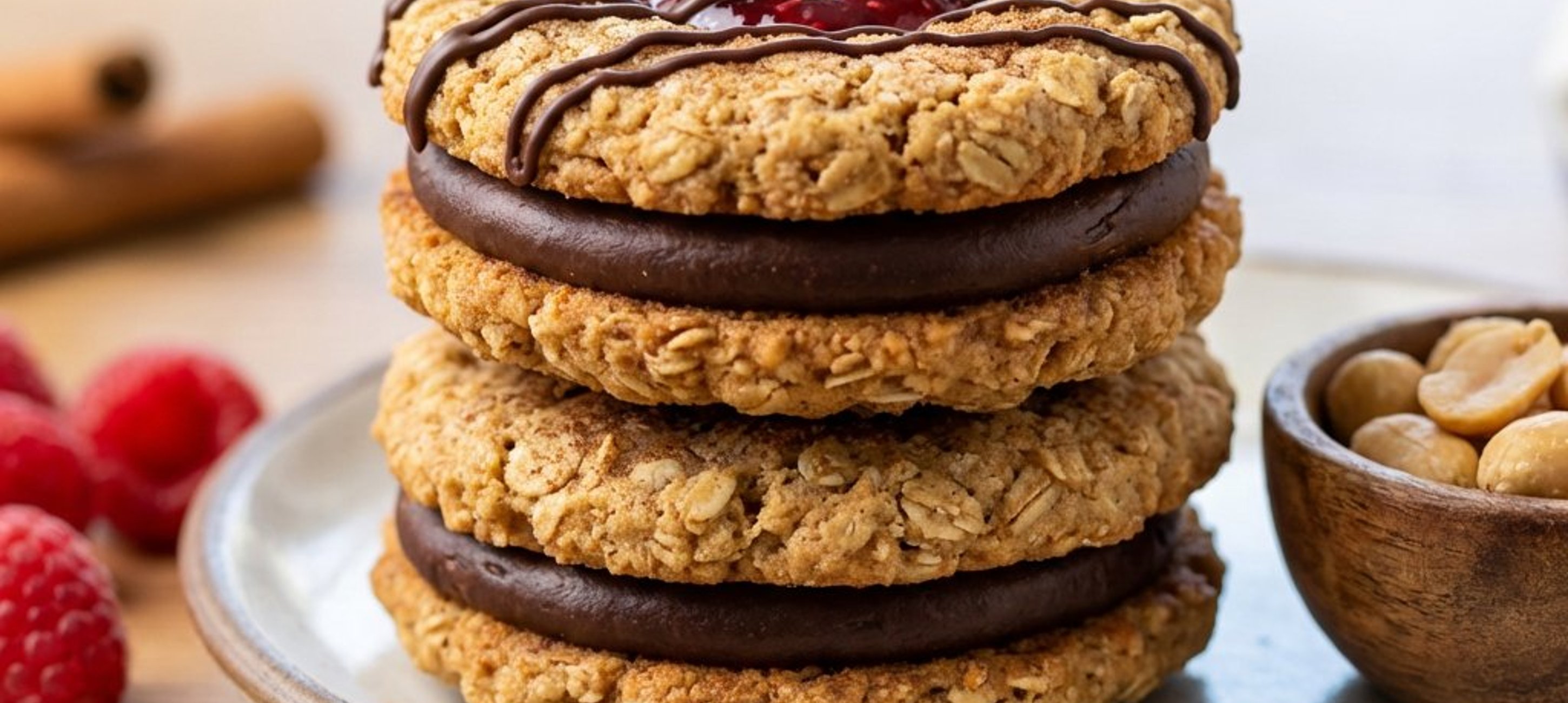 - 1Topiți restul de 50 g de ciocolată neagră cu uleiul de măsline la bain-marie. Decorați jumătate din biscuiți cu linii de ciocolată. Pe cealaltă jumătate, formați un inel din crema de ciocolată, puneți în mijloc jeleul de zmeură și acoperiți cu biscuiții decorați. Lăsați la frigider pentru fixare.