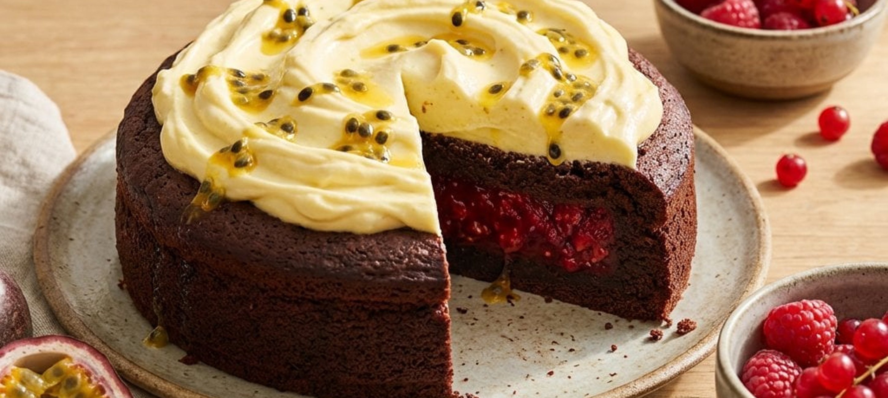 - 1Taie blatul pe orizontală în două. Pe prima parte, întinde jeleul de fructe uniform. Așază a doua parte de blat deasupra, întinde crema de ciocolată albă și decorează cu semințele de fructul pasiunii păstrate.