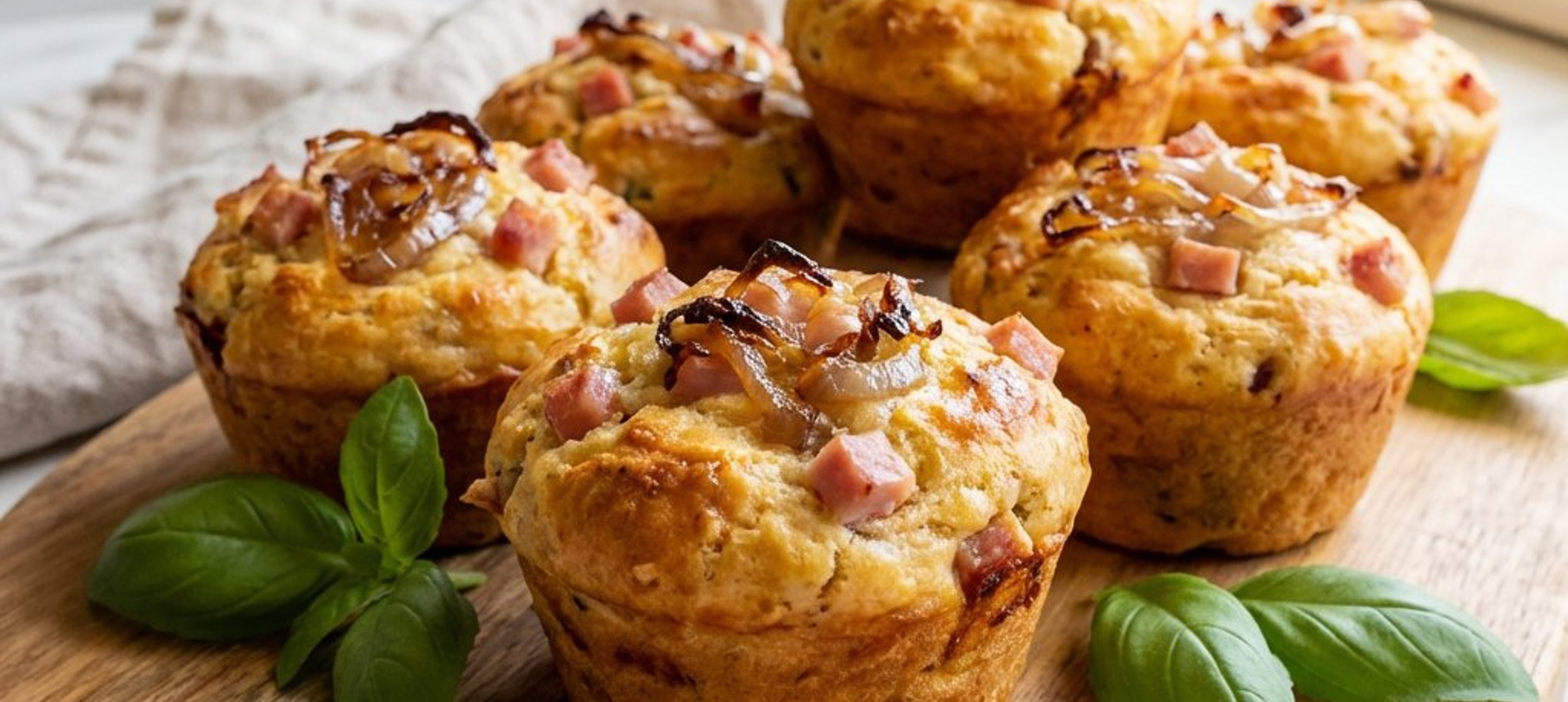 - 1Umpleți formele de brioșe (tapetate cu hârtie specială) până la 3/4 din capacitate. Presărați deasupra amestecul caramelizat de șalotă și șuncă.