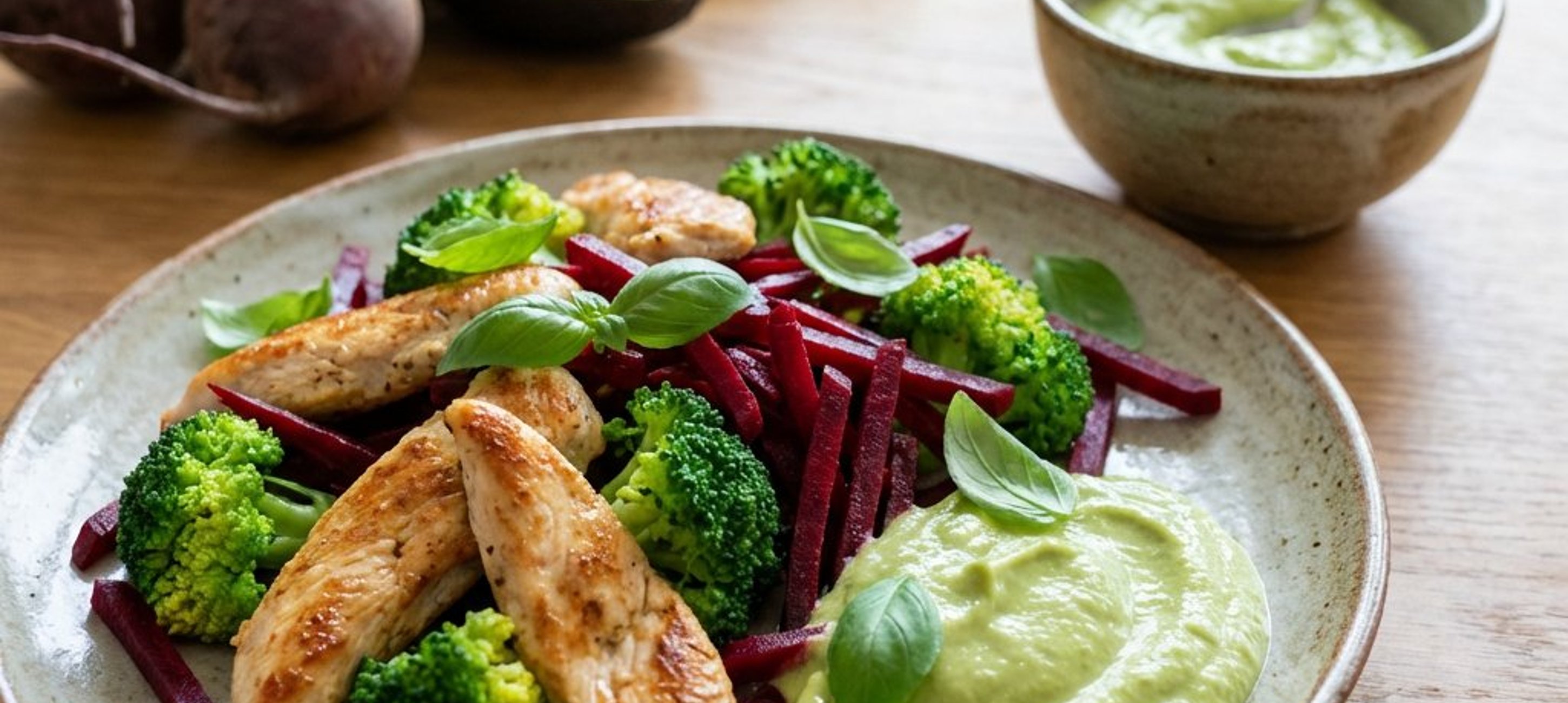 Pentru un gust mai intens, puteți trage sfecla roșie la tigaie pentru 1-2 minute împreună cu marinada înainte de servire. Această salată este bogată în grăsimi sănătoase din avocado și proteine de calitate din pui.