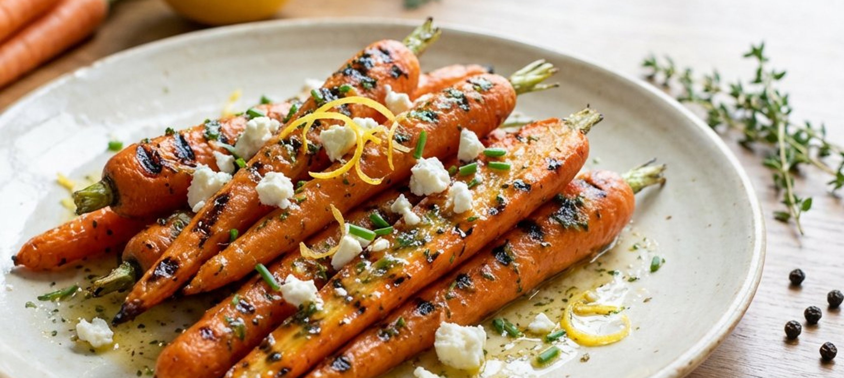 - 5Imediat ce morcovii sunt gata, transferați-i de pe grătar direct în bolul cu marinadă și amestecați bine pentru a-i acoperi uniform. Așezați-i pe un platou, presărați arpagicul verde tocat și brânza feta sfărâmată deasupra. Serviți imediat.