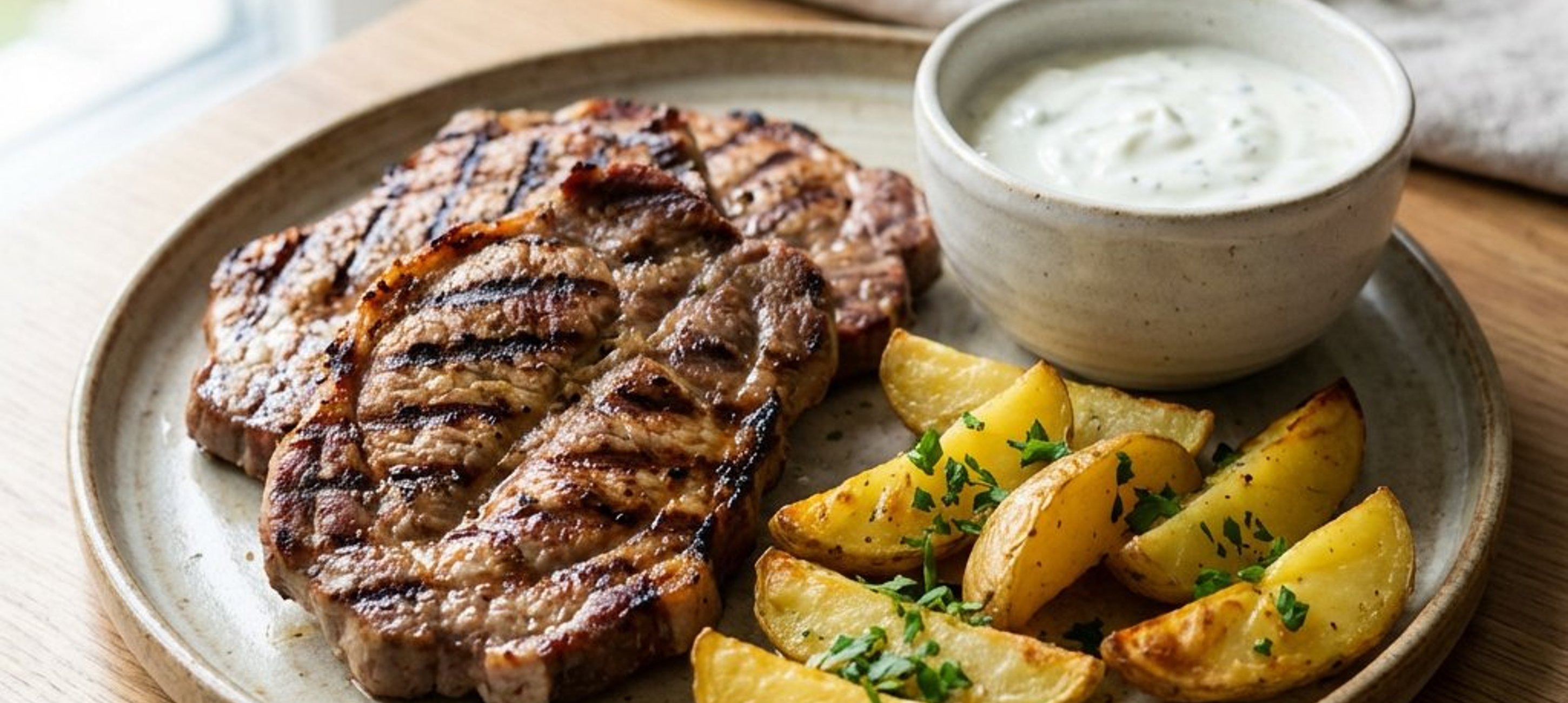 - 2Pentru dip, amestecați iaurtul grecesc cu usturoiul zdrobit, un praf de sare și puțin pătrunjel tocat. Serviți carnea fierbinte alături de cartofii copți și sosul răcoros.