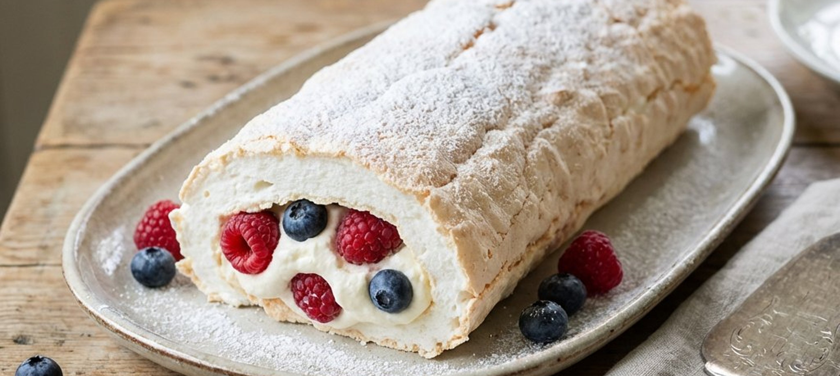 - 1Pregătiți pe suprafața de lucru un prosop de bucătărie curat și o foaie nouă de hârtie de copt. Răsturnați cu grijă blatul de bezea pe hârtia curată și îndepărtați hârtia pe care s-a copt. Întindeți frișca bătută tare, apoi adăugați restul de piure de fructe (creând același model abstract ca la blat). Distribuiți fructele proaspete deasupra. Cu ajutorul prosopului și al hârtiei, rulați strâns pe latura lungă. Lăsați rulada la frigider, învelită în hârtie și prosop, timp de aproximativ două ore înainte de servire.