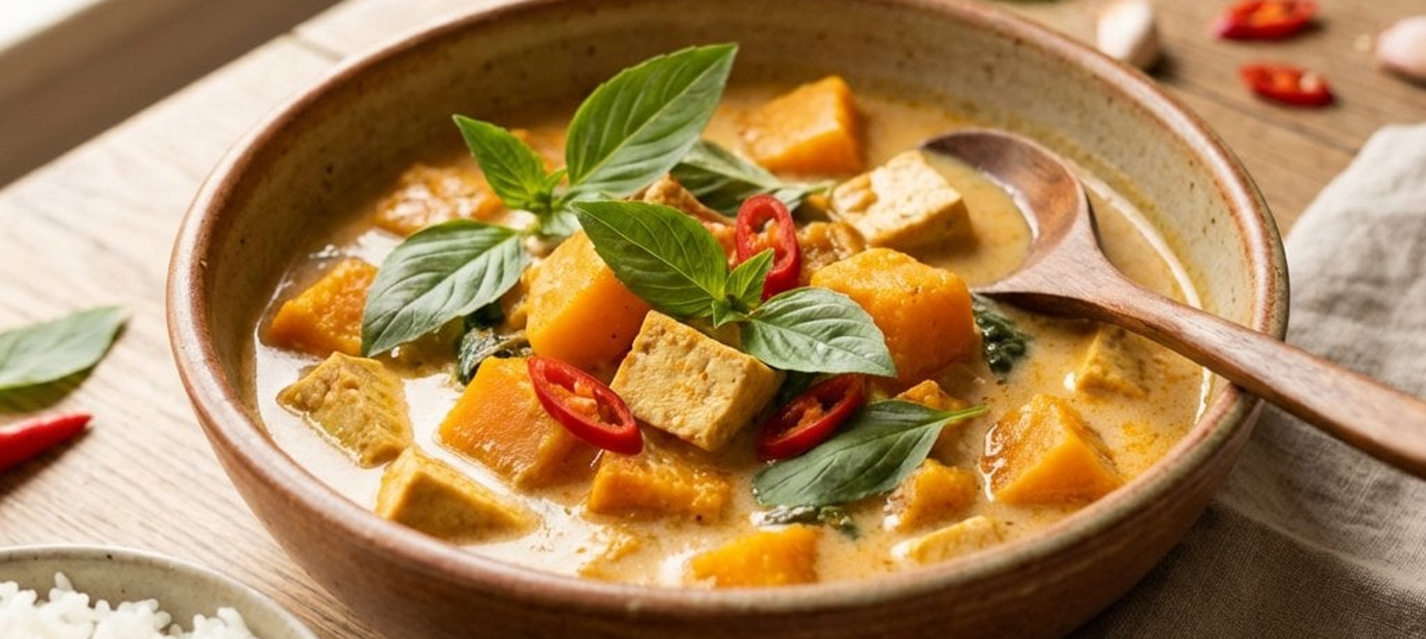 - 3La final, adăugați dovleacul copt tăiat cubulețe în sos. Condimentați cu sos de soia și sare după gust. Presărați busuioc Thai proaspăt și felii de ardei iute deasupra.