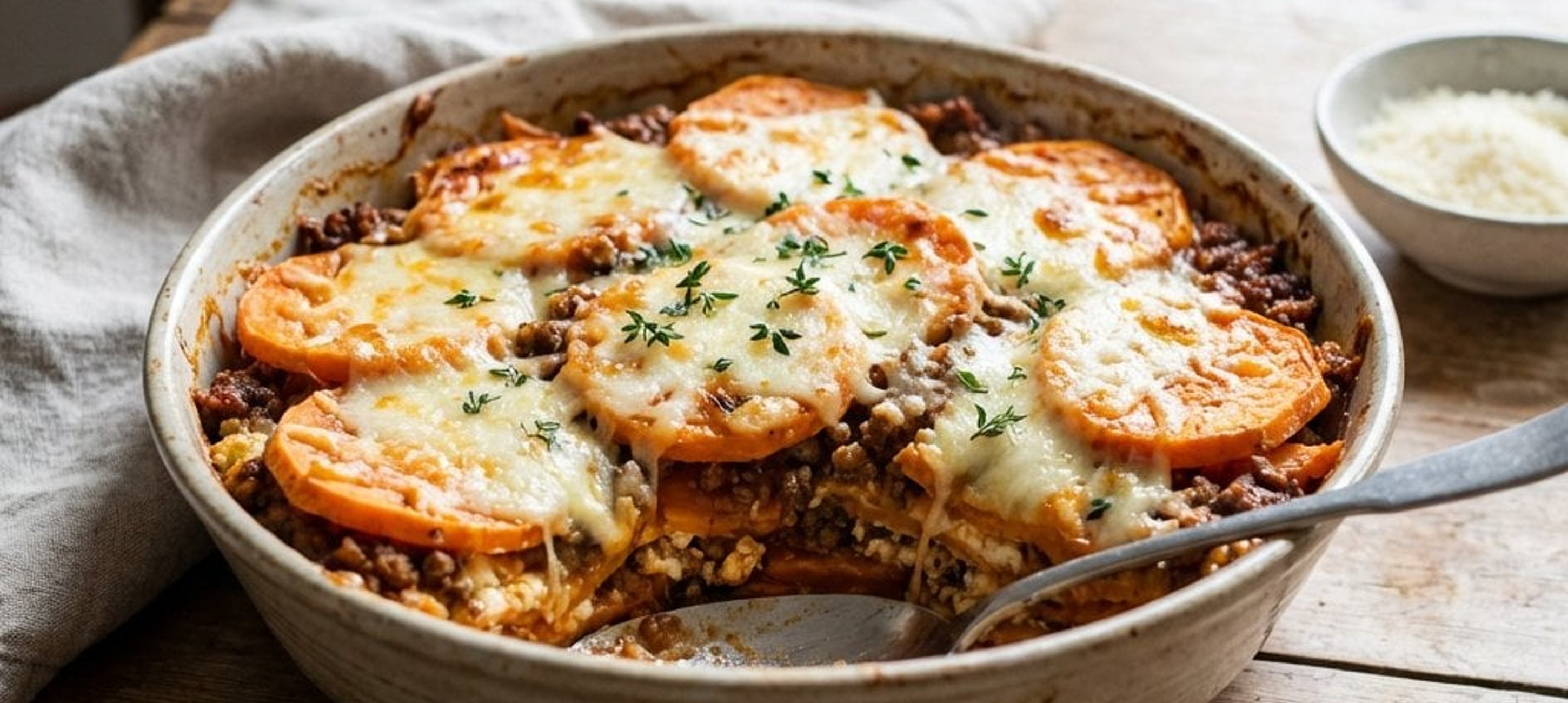 - 1Pregătiți o tavă de copt (aproximativ 20 cm × 40 cm). Creați primul strat din jumătate din feliile de cartof dulce, așezându-le pe fundul tăvii. Turnați deasupra jumătate din amestecul de carne și întindeți-l uniform. Apoi, adăugați jumătate din amestecul de brânză cottage. Repetați acești pași încă o dată, iar la final presărați mozzarella rasă deasupra.