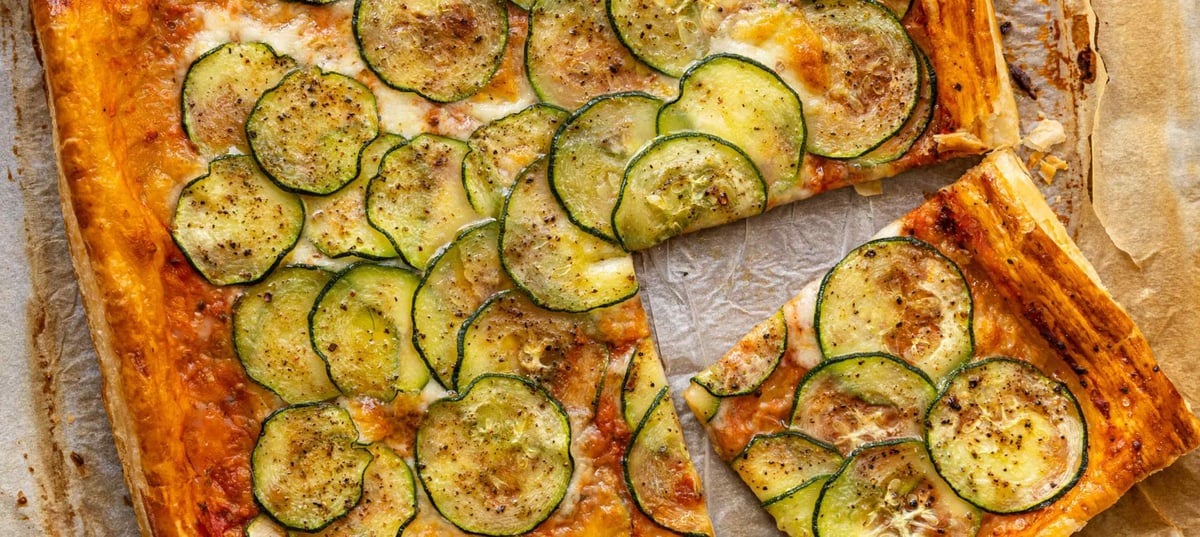 - 2Desfă aluatul foietaj împreună cu hârtia de copt și întinde pe toată suprafața passata pregătită, lăsând aproximativ 1 cm liber pe margini. Scoate mozzarella din saramură, stoarce-o ușor, apoi rupe-o în bucăți mici și distribuie-o uniform peste aluat. Așază feliile de dovlecel deasupra, ușor suprapuse.