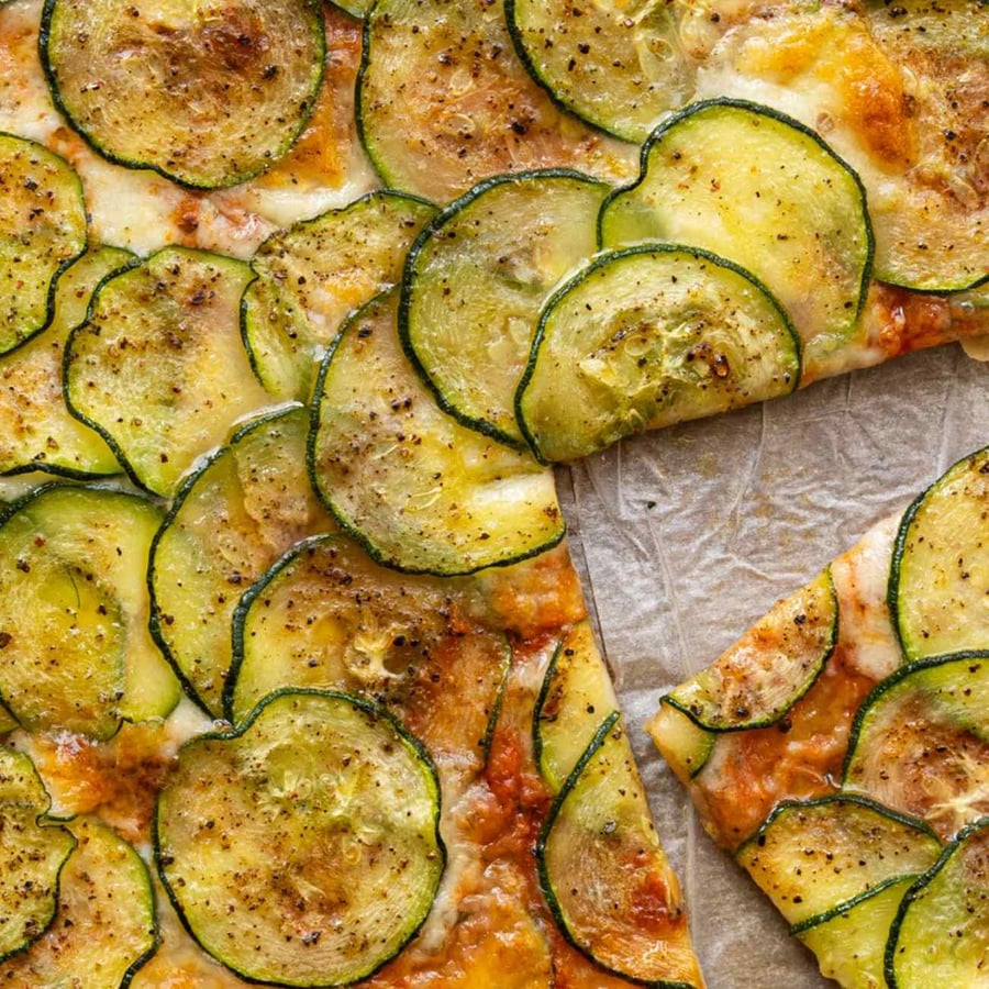 - 1Preîncălzește cuptorul la 200 °C și pregătește o tavă de copt. Amestecă passata de roșii cu oregano uscat, un cățel de usturoi zdrobit și sare. Taie dovlecelul în felii subțiri, folosind un cuțit sau o mandolină.