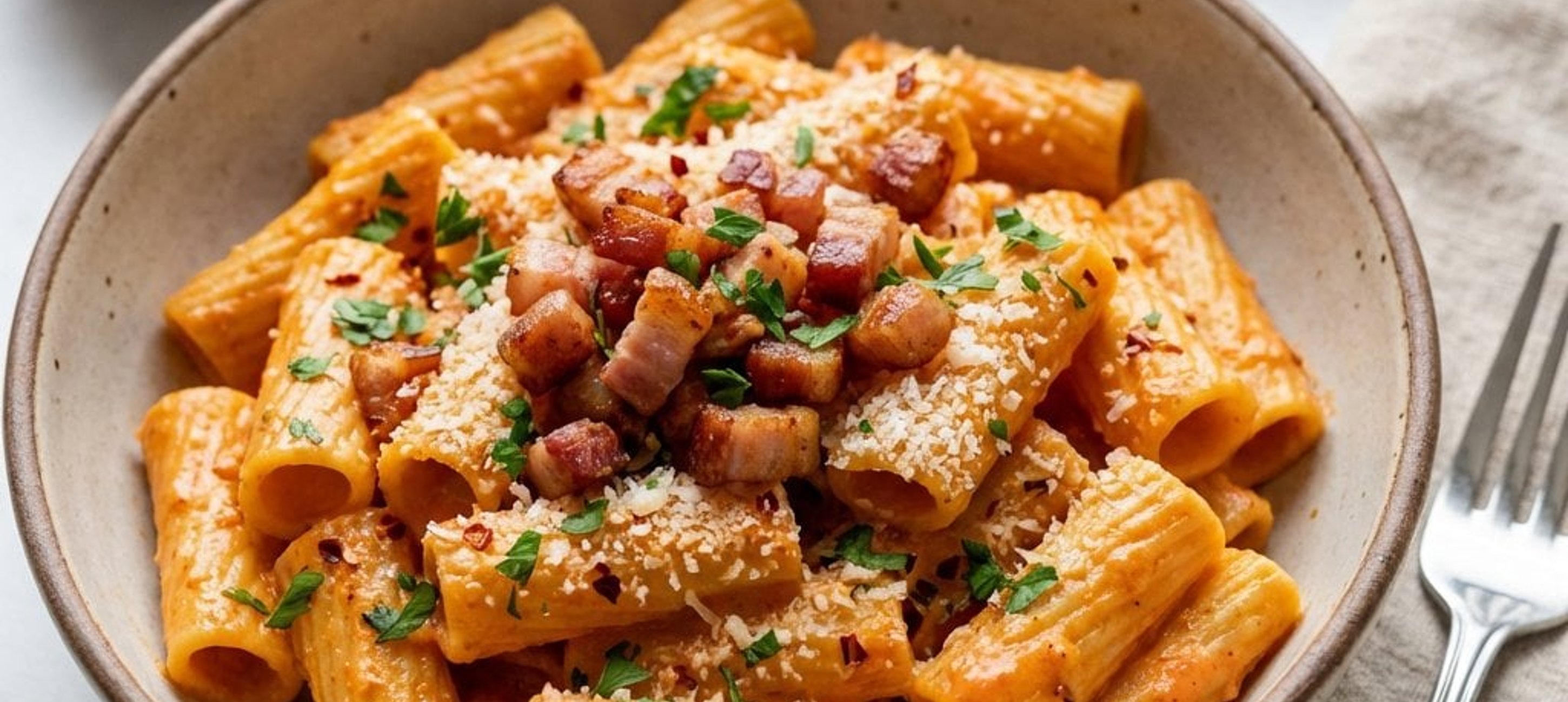 - 4Amestecă pastele fierte cu sosul cremos, pancetta crocantă și pătrunjelul tocat mărunt. Servește imediat cu parmezan ras fin deasupra.