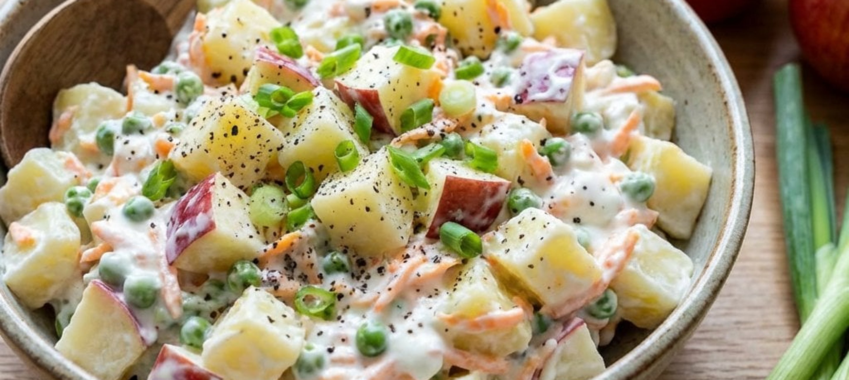 - 2După ce cartofii s-au răcit, curățați-i de coajă, tăiați-i în cubulețe de 1 cm și puneți-i într-un bol încăpător. Adăugați iaurtul grecesc, mazărea, castraveții, ceapa, morcovul, sucul de lămâie, sarea, piperul, merele și ouăle. Amestecați totul bine.