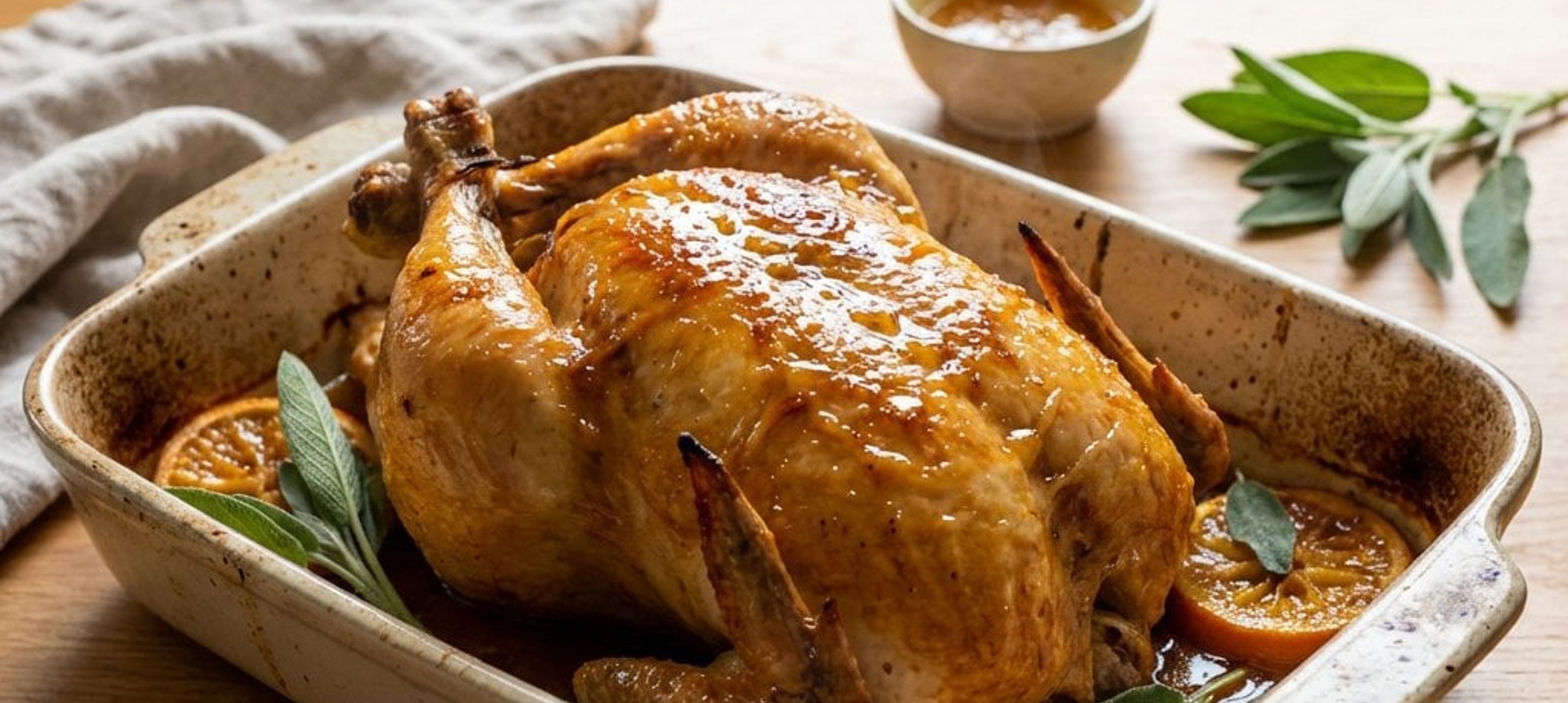 - 4După acest timp, îndepărtați folia de aluminiu și măriți temperatura cuptorului la 195–200 °C. Lăsați puiul să se rumenească încă 45–50 de minute. În acest timp, stropiți periodic puiul cu sosul format în tavă.