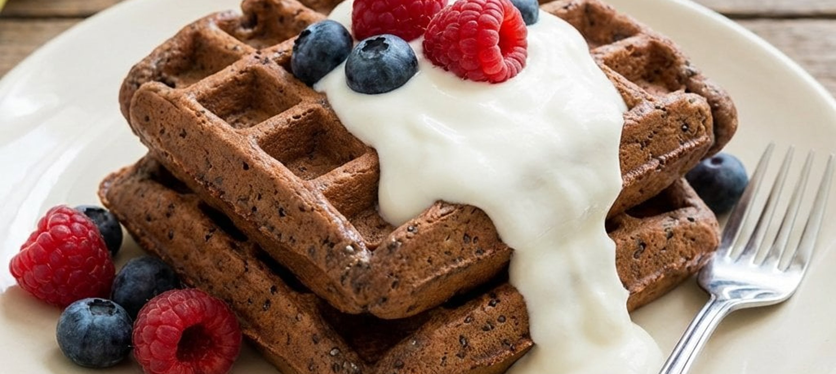 - 2Încingeți aparatul de vafle și ungeți-l ușor cu puțin ulei de cocos dacă este necesar. Turnați compoziția și coaceți vaflele timp de aproximativ 10 minute sau până când sunt bine făcute și ușor crocante la exterior. Scoateți-le cu grijă și serviți-le calde cu smântână și fructe de pădure.