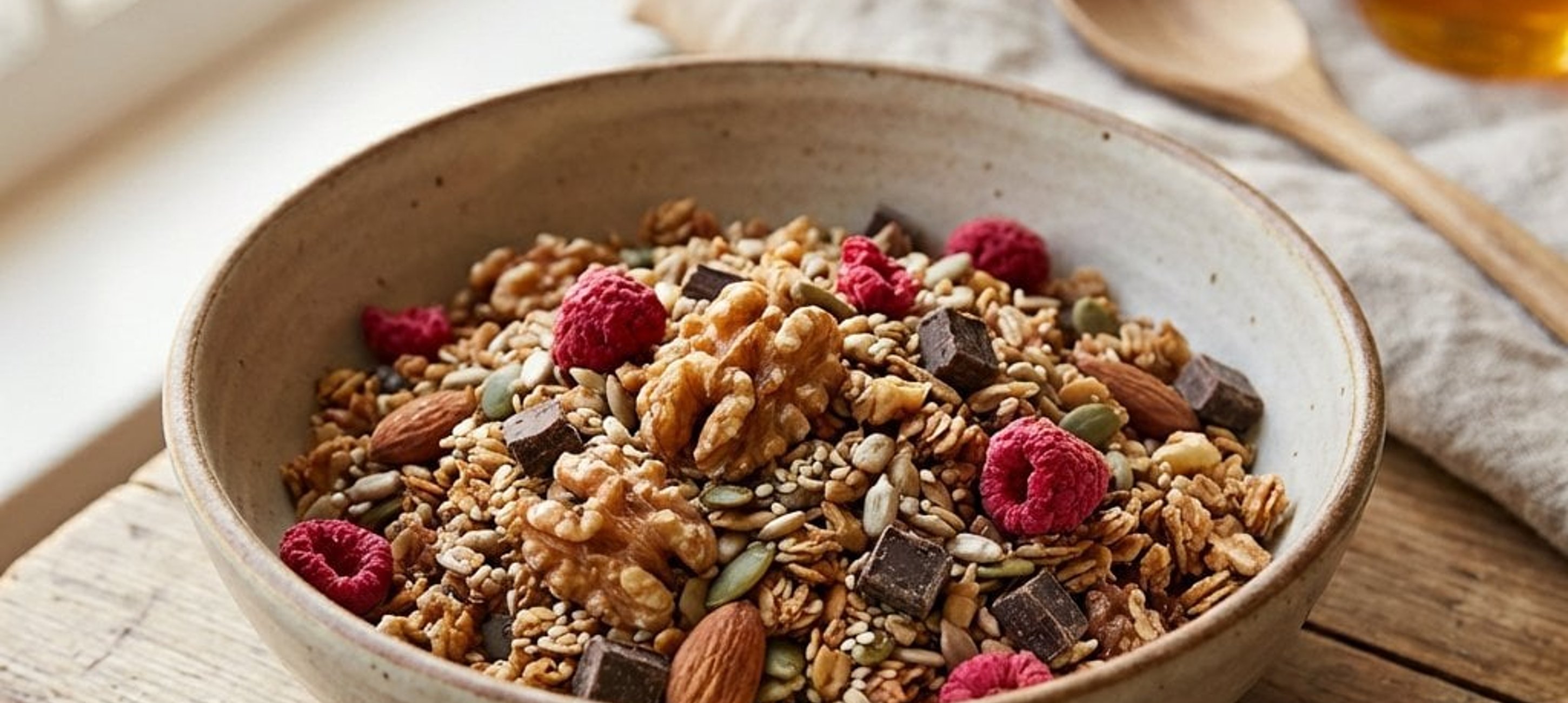 - 4La final, după ce ați scos granola din cuptor și s-a răcit puțin, încorporați zmeura liofilizată. Depozitați într-un recipient etanș după răcirea completă.