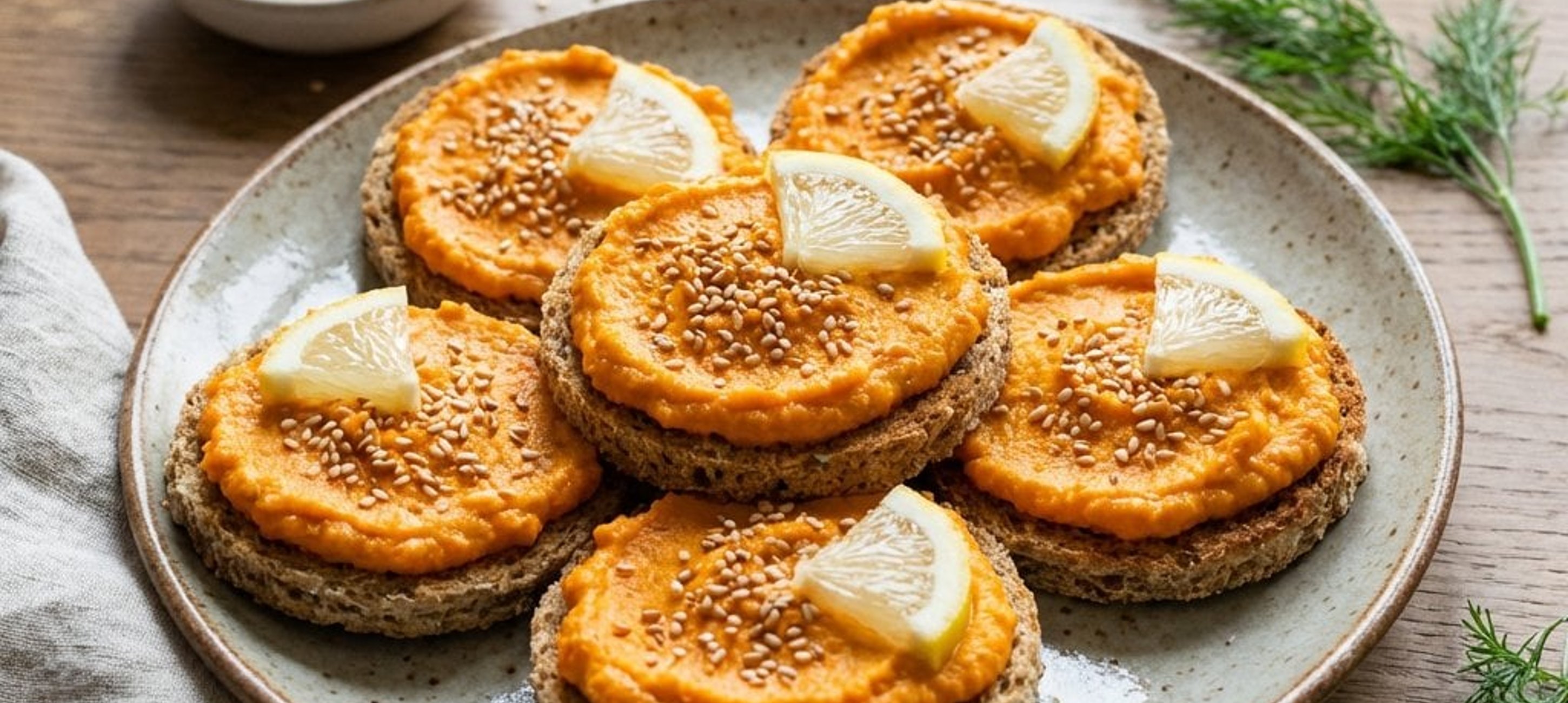 - 3Decorează canapés-urile cu semințe de susan și felii subțiri de lămâie proaspătă înainte de servire.