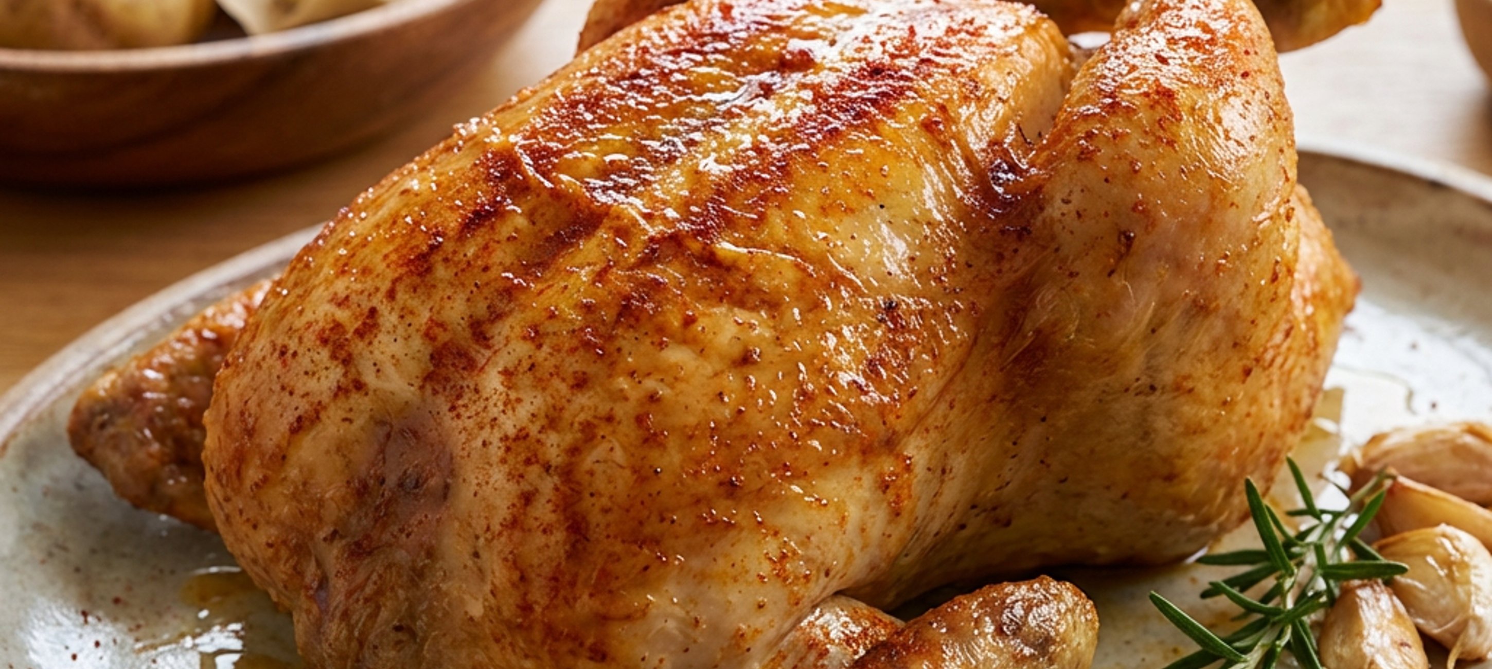 - 7Sugestii: Poți introduce în interiorul puiului crenguțe de cimbru, rozmarin sau foi de dafin pentru o aromă mai intensă. În tavă poți adăuga ceapă, usturoi sau câteva felii de slănină. Pentru o piele și mai crocantă, poți adăuga o linguriță de usturoi pudră în amestecul de condimente. Servește puiul alături de garnitura preferată: cartofi copți, orez basmati sau paste.