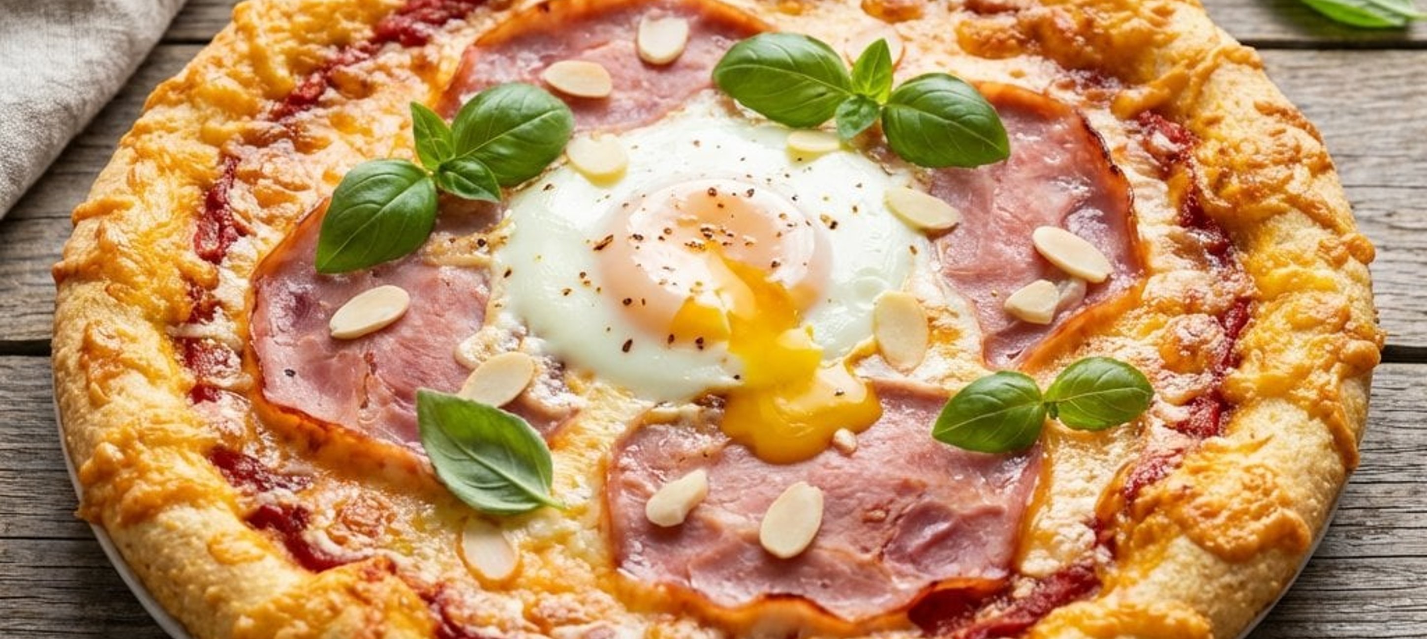 - 1Într-un bol mic, amestecă pasta de tomate cu apa, oregano, restul de busuioc (0.5 linguriță), un praf de sare și piperul. Întinde acest sos uniform peste blatul pre-copt. Așază feliile de șuncă deasupra și sparge ultimul ou în centrul pizzei. Introdu pizza din nou la cuptor pentru încă 15 minute, până când oul este gătit și marginile sunt crocante.