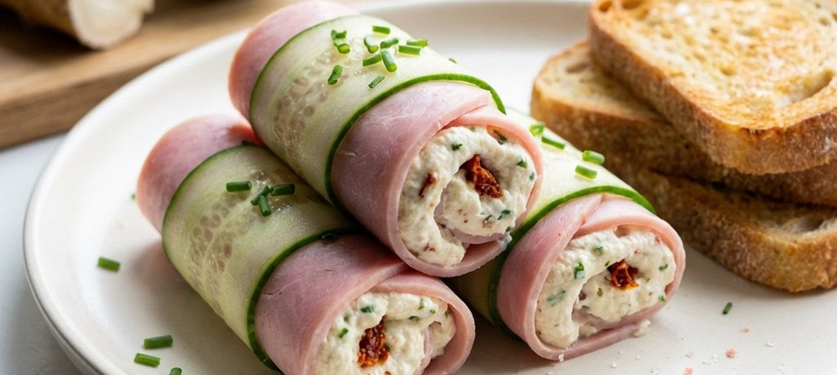 - 2Folosind un curățător de legume, tăiați 6-8 fâșii lungi și subțiri din castravete. Înfășurați fiecare rulou de șuncă într-o fâșie de castravete pentru un aspect proaspăt și decorativ.
