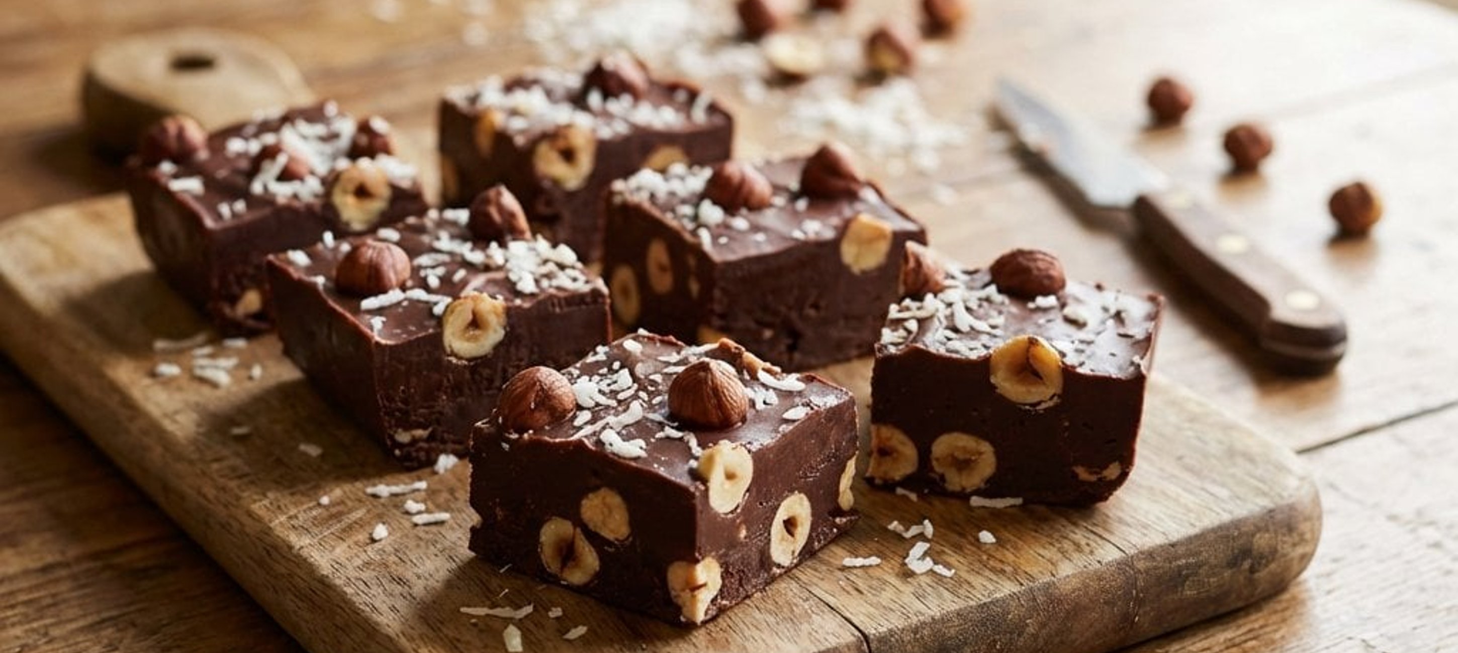- 2După ce s-a întărit, scoateți fudge-ul din formă cu ajutorul foliei, tăiați-l în pătrățele de mărimea dorită și serviți. Se poate păstra la congelator timp de 1-2 luni.