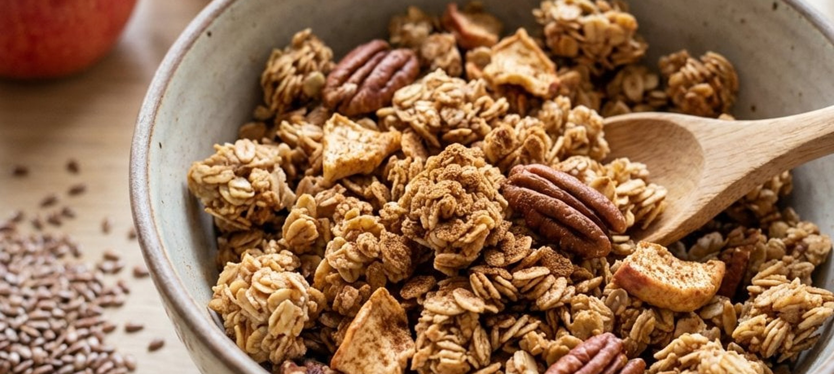 - 2Într-un bol încăpător, adaugă fulgii de ovăz, nucile pecan (întregi sau tăiate grosier), semințele de in, siropul de agave și scorțișoara. Amestecă totul bine cu piureul de mere până când compoziția este omogenă.
